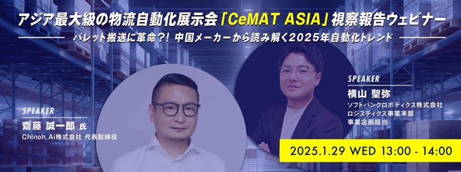 Chinoh.Ai株式会社(本社:渋谷区、代表取締役 齋藤誠一郎)はソフトバンクロボティクス株式会社(本社:東京都港区、代表取締役社長 兼 CEO:冨澤 文秀)と法人向けオンライセミナー「アジア最大級の物流自動化展示会『CeMAT ASIA』視察報告ウェビナー」を2025年1月29日(水)に共催します。