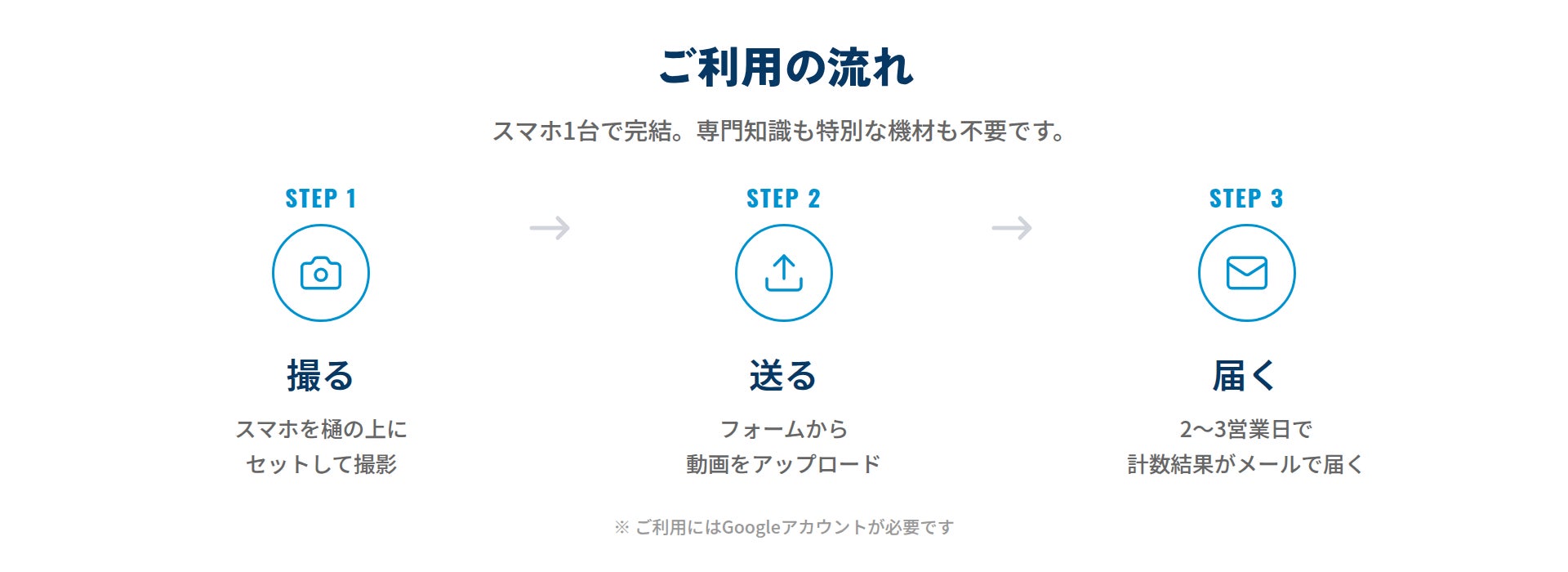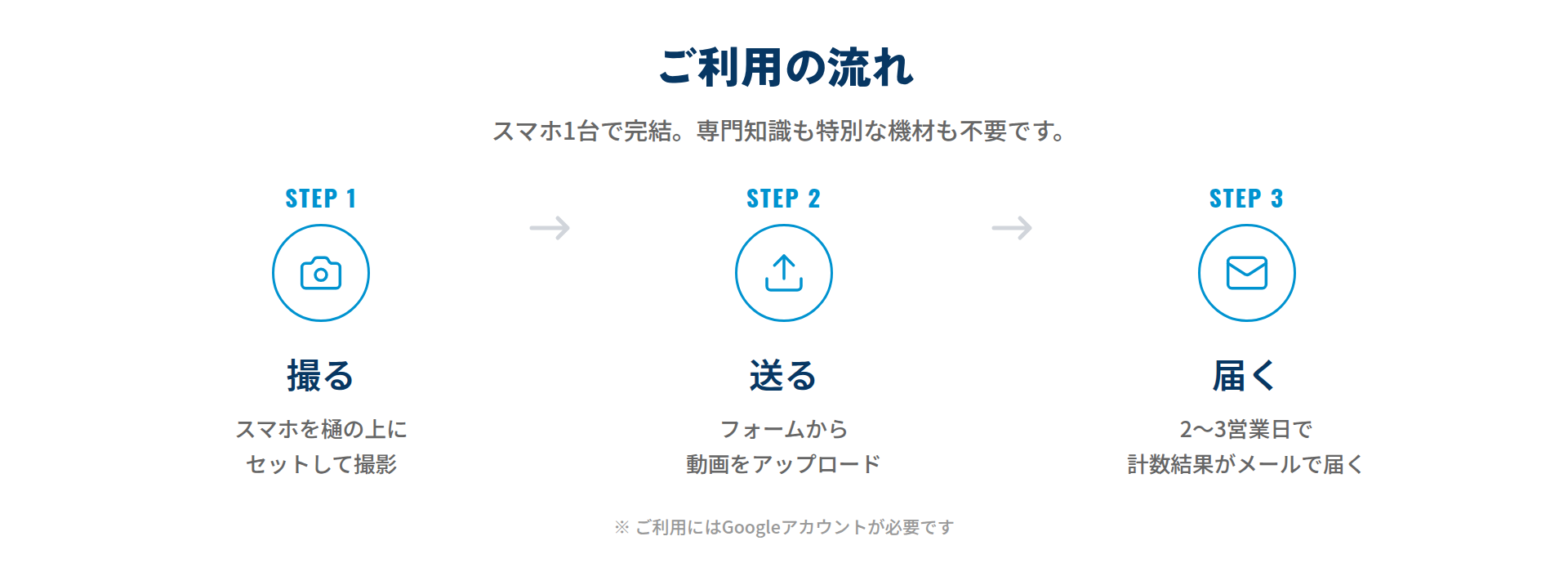 動画をフォームからアップロードすると、計数結果がメールで届く。現場での複雑な操作は不要。