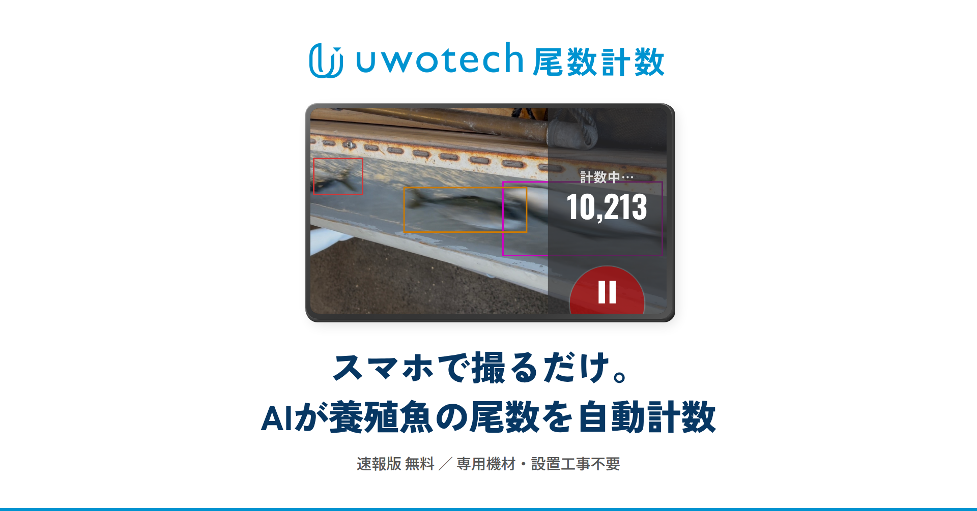 「uwotech 尾数計数」は、養殖魚のワクチン接種時や分養時にスマートフォンで撮影した動画をAIが解析し、尾数を自動計数するサービスです。