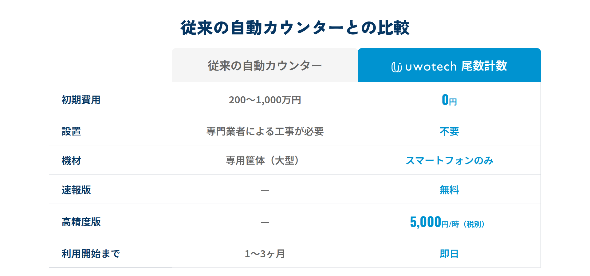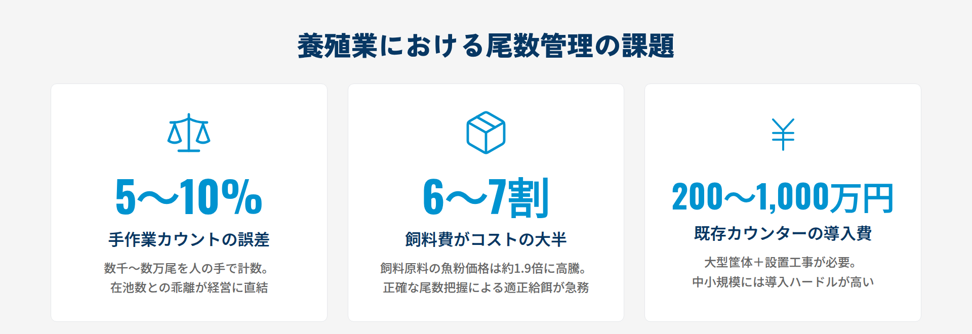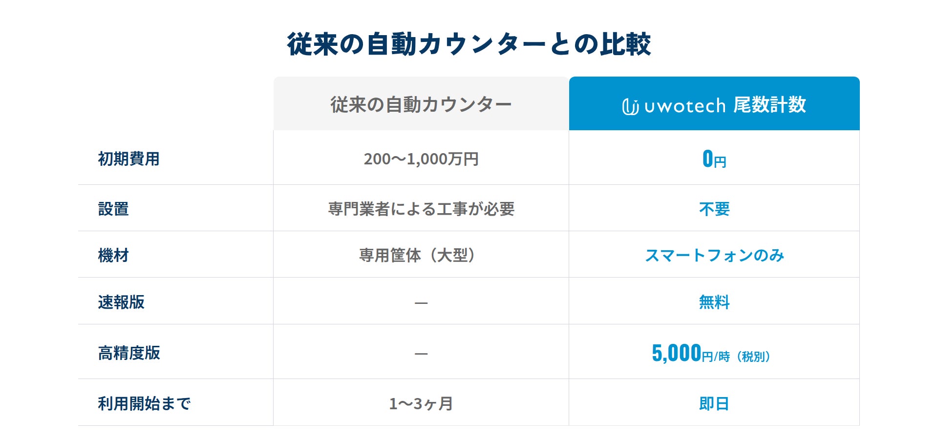 一方、2023年漁業センサス(農林水産省)によれば、漁業就業者数は12万1,230人と5年前から20.1%減少し、個人経営体では65歳以上が53.7%を占めます。養殖現場でも人手不足と高齢化が進む中、数千〜数万尾を人の手で数える従来の計数作業は現場にとって大きな負担となっています。水産庁も「スマート水産業」の一環としてICT・AIを活用した尾数カウントシステムの導入を推進していますが、既存の自動カウンター(自動計数機)は200万〜1,000万円の導入費用に加え、大型筐体の設置工事が必要であり、中小規模の養殖業者にとって導入ハードルが高い状況です。こうした背景から、アクアクラフトは養殖業向けクラウドサービス「uwotech pro」の運営を通じて把握した現場の計数課題を解決するため、スマートフォンとAIによる新たな計数手段を開発しました。