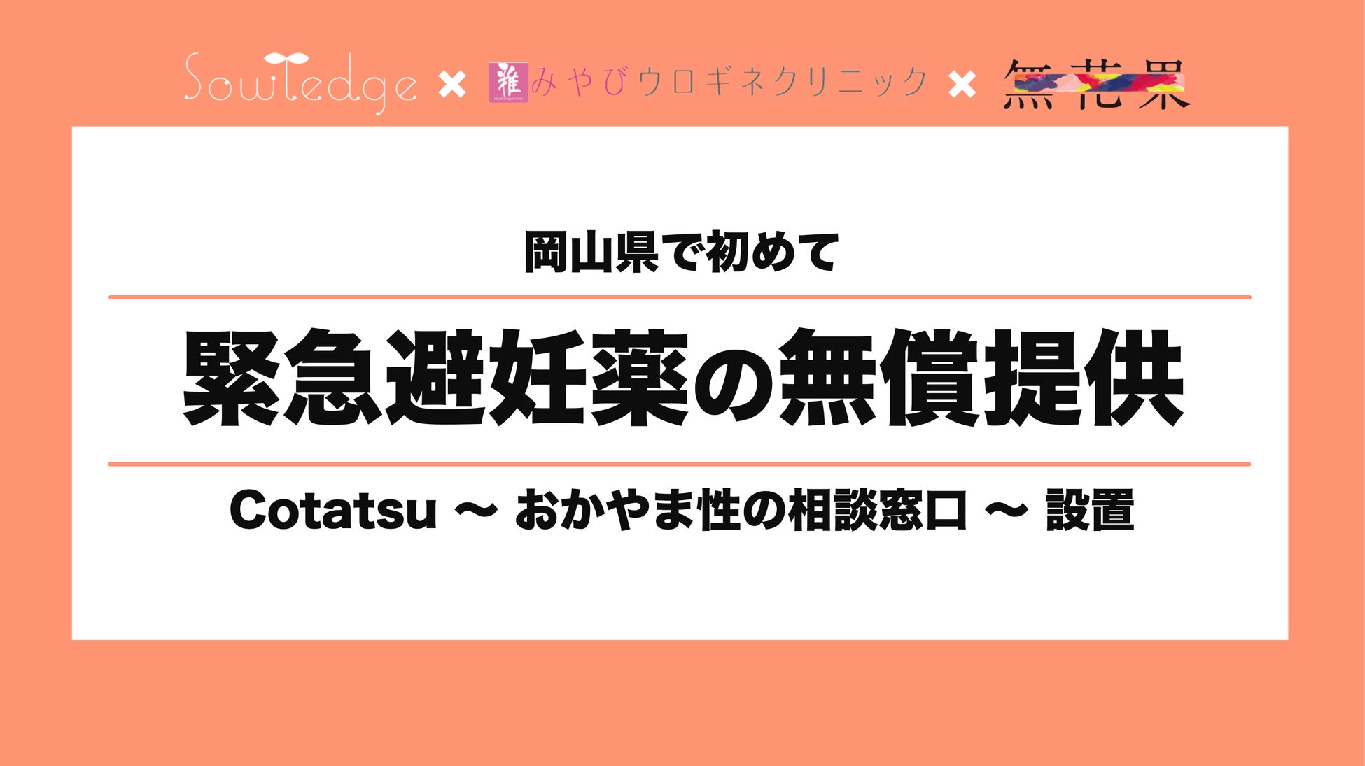 これまで無花果で行っていた性教育に加えて、より具体的な取り組みを実装し広げていけることを、 心から嬉しく感じております。「避妊に失敗したかも」というとき、きっと不安で仕方がないと思い ます。身近に緊急避妊薬を無償提供するクリニックがあることで、相談や受診のハードルが少しでも 下がるといいなと感じております。また同時に、性にまつわる様々な悩みを匿名で相談できる窓口を 設置しています。性の多様性を尊重する声が大きくなっている一方で、性にまつわる話題をタブー視する姿勢やジェンダー規範も根強く残っています。「Cotatsu 〜 おかやま性の相談窓口 〜」では、 匿名性を維持したままチャットやオンラインで相談ができますので、「人には言いにくいけど誰かに相談したい」「話を聞いてもらいたい」というときに、ぜひ使っていただけると嬉しいです。この取り組みが、一人でも多くの人の安心につながりますことを、心から願っています。