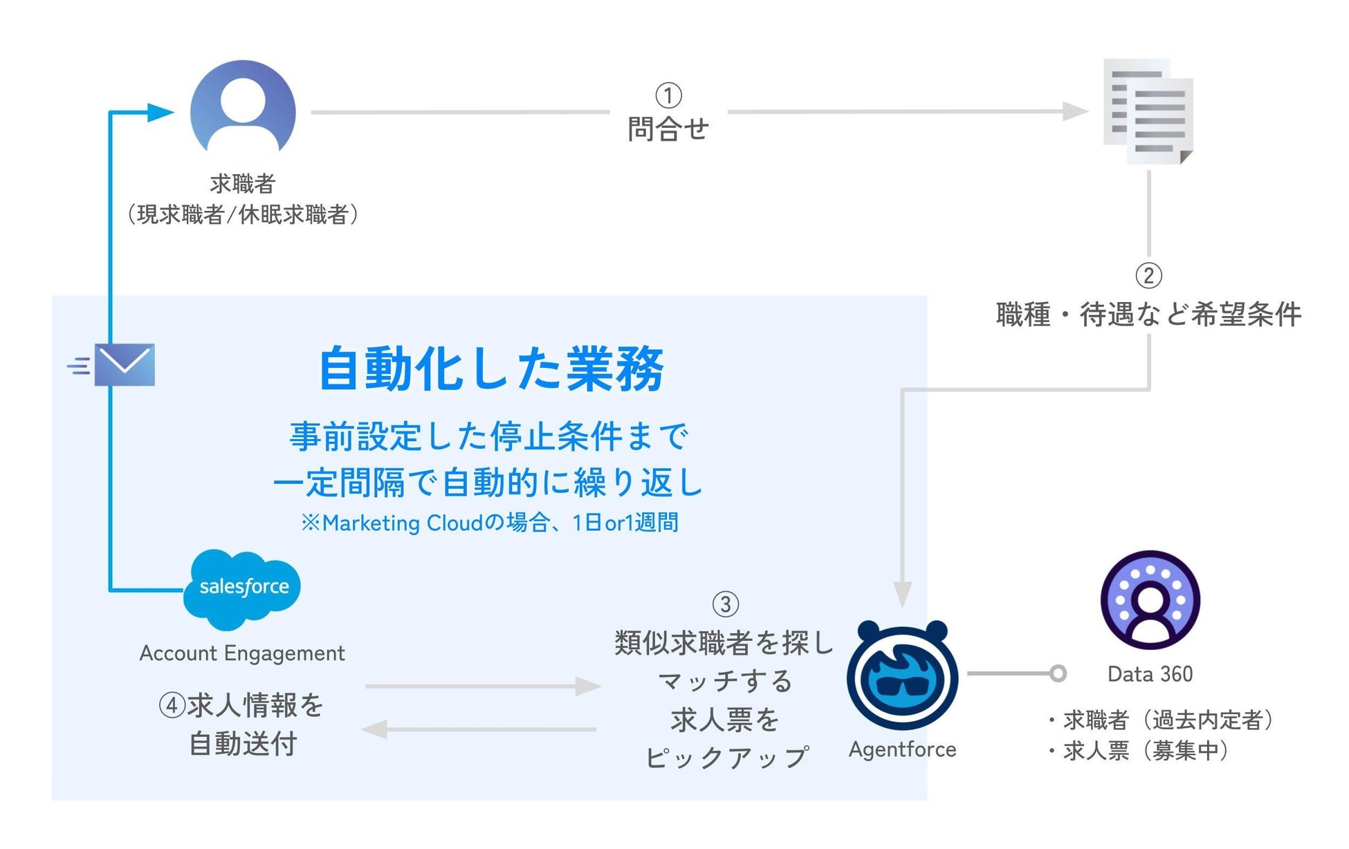 本パッケージは、AgentforceとMAツールを連携させ、人材紹介業務における人材マッチングとフォローアップの一連の業務を自動化します。