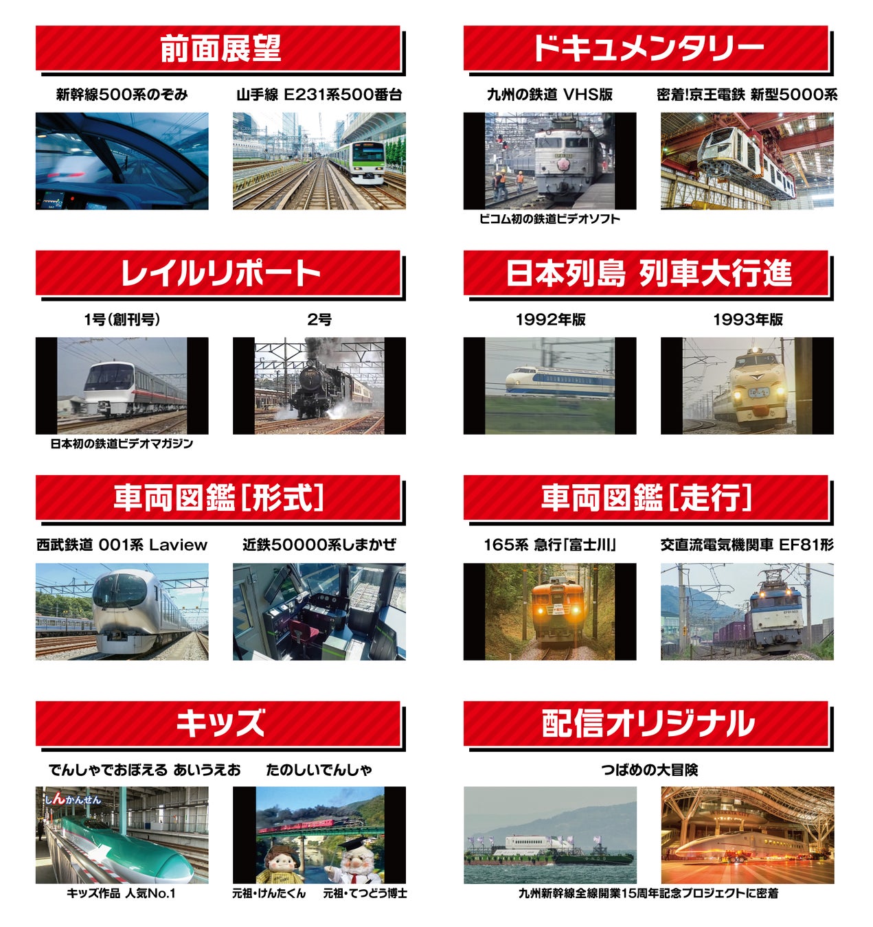 ・「前面展望」「鉄道ドキュメンタリー」「車両紹介や走行映像」「お子様向け」など、120以上の