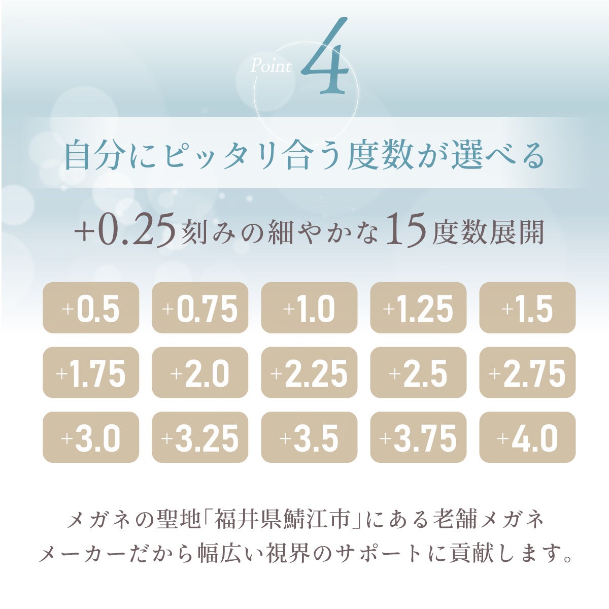 老眼鏡度数も+0.25刻みで選べるため、細かく度数を設定したいという要望にもお応えしております。