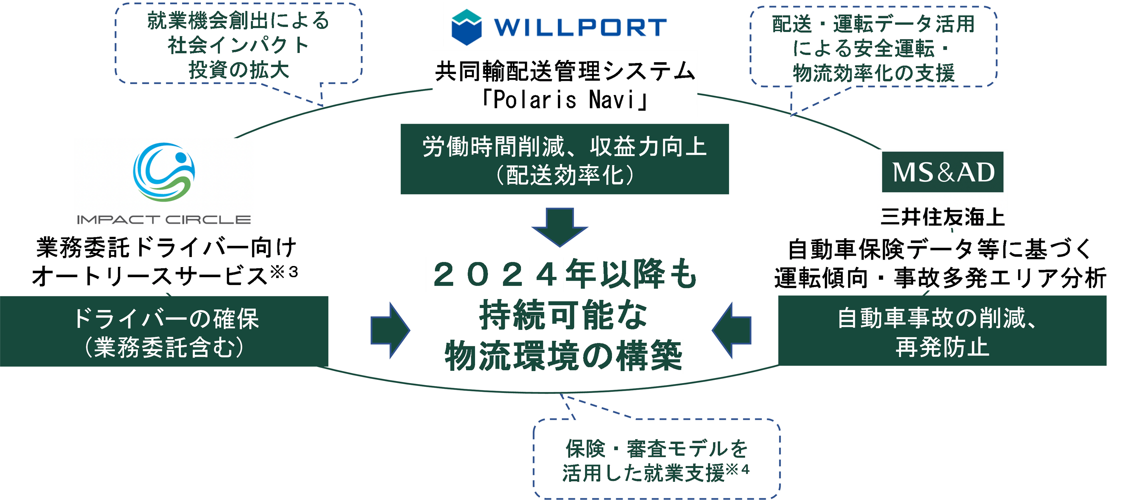 ウィルポート株式会社(社長:藤原 康則)とインパクトサークル株式会社(社長:高橋 智志)ならびに三井住友海上火災保険株式会社(社長:舩曵 真一郎)は、ラストワンマイル配送を担う運送事業者や業務委託ドライバーを支援するため、2023年9月に業務提携契約を締結しました。