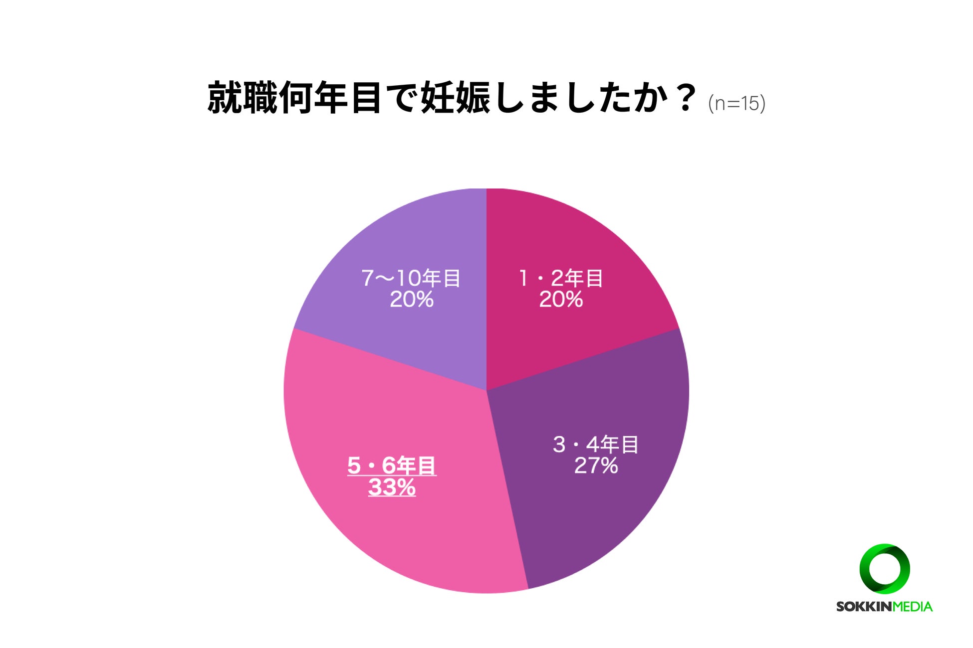 就職何年目で妊娠しましたか?という問いに対して、「就職してから5・6年目」という人が最も多く3割に上りました。次いで「3・4年目」27%となっています。