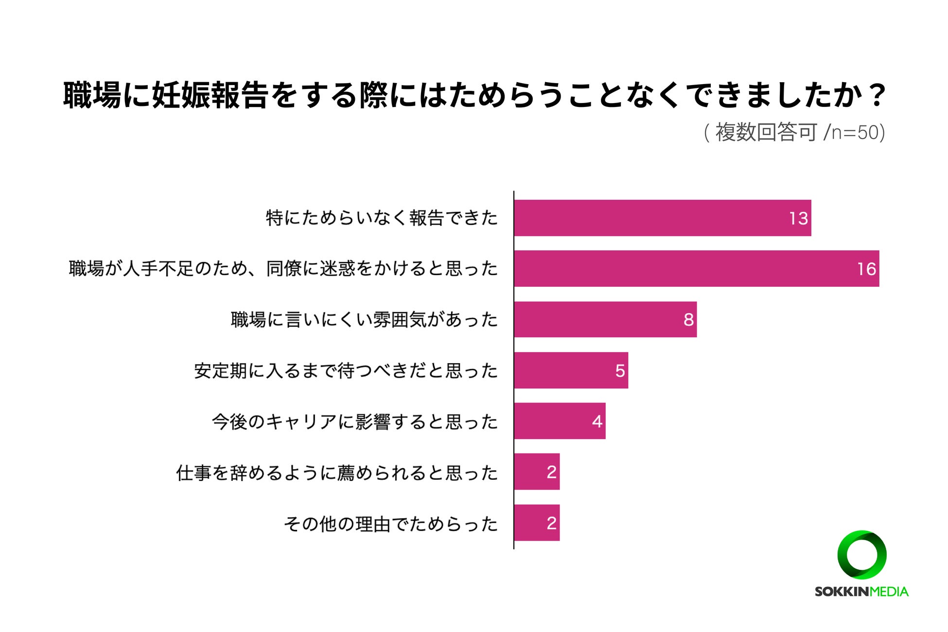 職場に妊娠報告をする際にはためらうことなくできましたか?(複数選択可)という問いに対して「特にためらいなく報告できた」と回答した人は全体の26%にとどまりました。