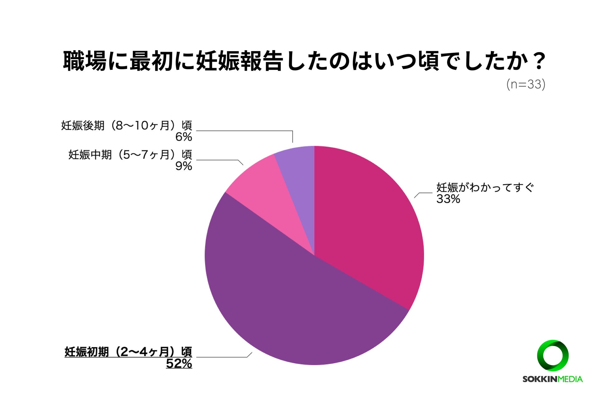 職場に最初に妊娠報告をしたのはいつ頃でしたか?という問いに対して、「妊娠初期(2~4ヶ月)頃」が最も多く挙がり、半数以上を占めました。次いで「妊娠がわかってすぐ」が33%と、比較的早めに職場に妊娠報告した人が多いことがわかります。