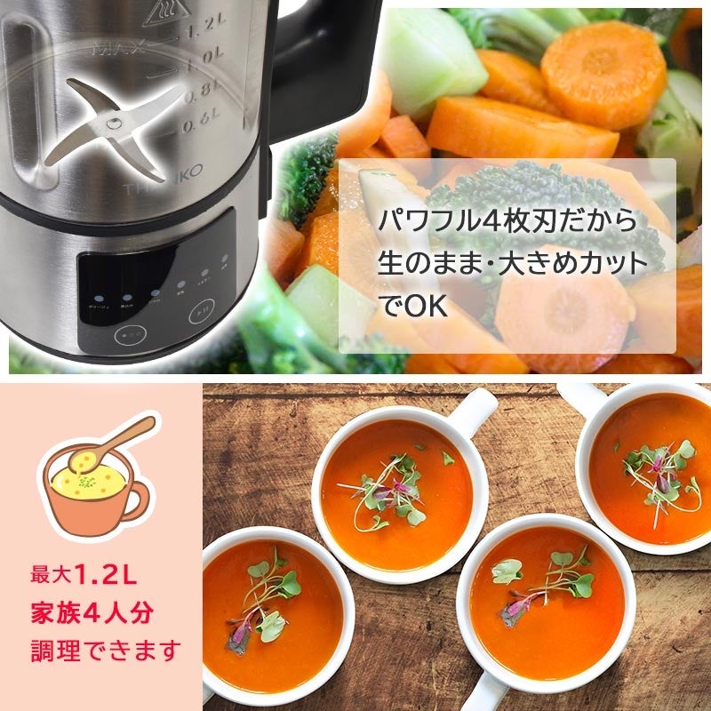 幅200×高さ270×奥行135mmとスリムな形状ながら最大1.2L約4人分の大容量サイズ。使い方は本体に食材と水を入れボタンを押すだけ。のどごしがなめらかなポタージュや、具材をごろごろと残した状態のまま調理する煮込みモード。ジャムが作れるジャムモード、乾燥豆から豆乳が作れる豆乳モードなど5種類のモードを搭載。ニンジンなどの硬い食材でも滑らかになるまで砕くことができるパワフルなモーターを搭載。付属のお掃除ブラシと洗浄ができる洗浄モードでお手入れも簡単です。