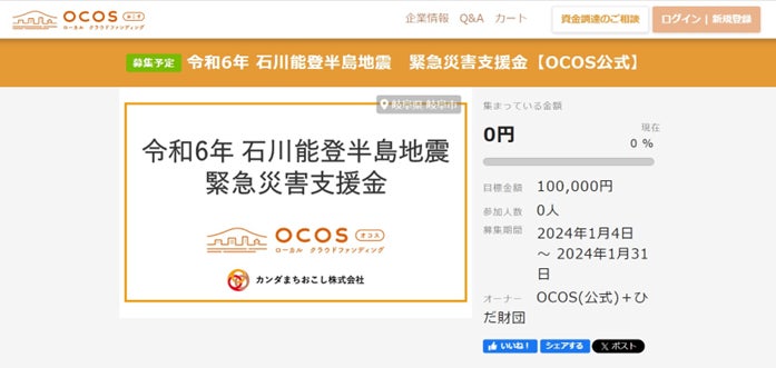 公益財団法人ほくりくみらい基金(所在地:石川県金沢市、代表理事:永井三岐子)は、カンダまちおこし株式会社(所在地:岐阜県岐阜市、代表取締役:田代達生)が運営するクラウドファンディングプラットフォーム「OCOS(オコス)」で立ち上げられた「令和6年 石川能登半島地震 緊急災害支援プロジェクト」の寄付先に選定されました。