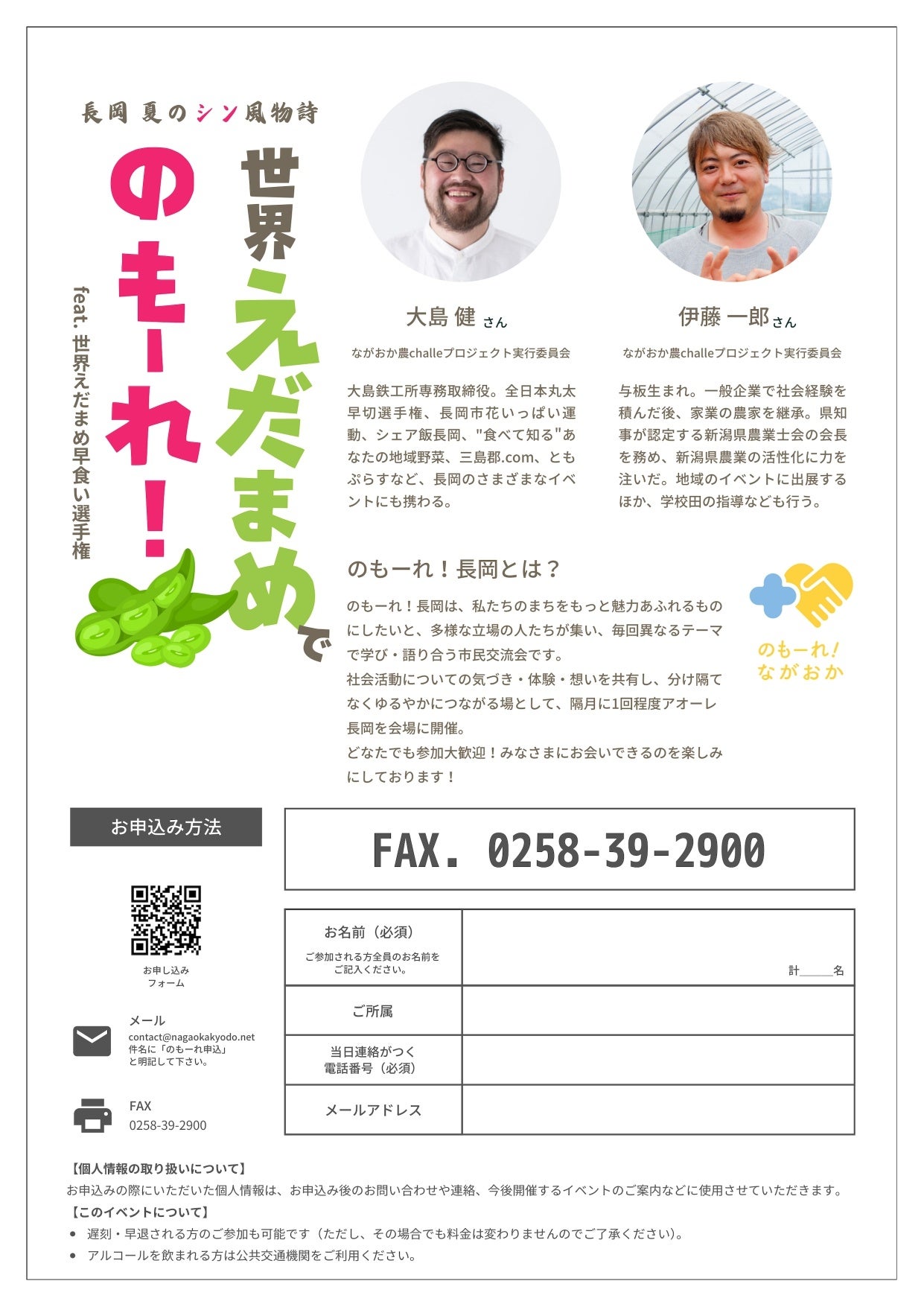 長岡夏の一大イベントとなった「世界えだまめ早食い選手権」を運営している「ながおか農challeプロジェクト実行委員会」の大島 健さんと、同じく実行委員で枝豆の生産農家である伊藤 一郎さんをお招きし、選手権が始まった経緯やイベントの裏側、早食いのコツなどをゲストトークしていただきます。