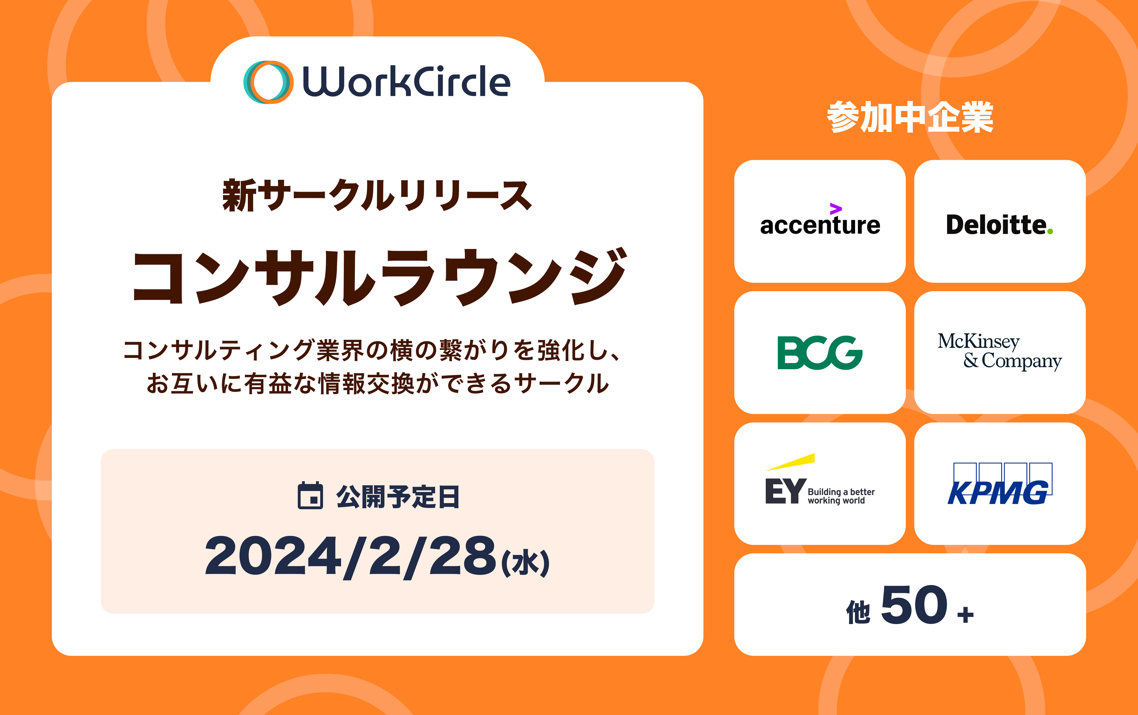 2024年2月28日、「全ての労働者が最善なキャリア選択の出来る社会の実現」をビジョンに掲げる社会人向けSNS「WorkCircle(ワークサークル)」を運営する株式会社WorkCircle(本社:東京都新宿区、代表取締役:冨成俊亮)は、コンサルティング業界向けに新たに「コンサルラウンジ」をリリースしました。