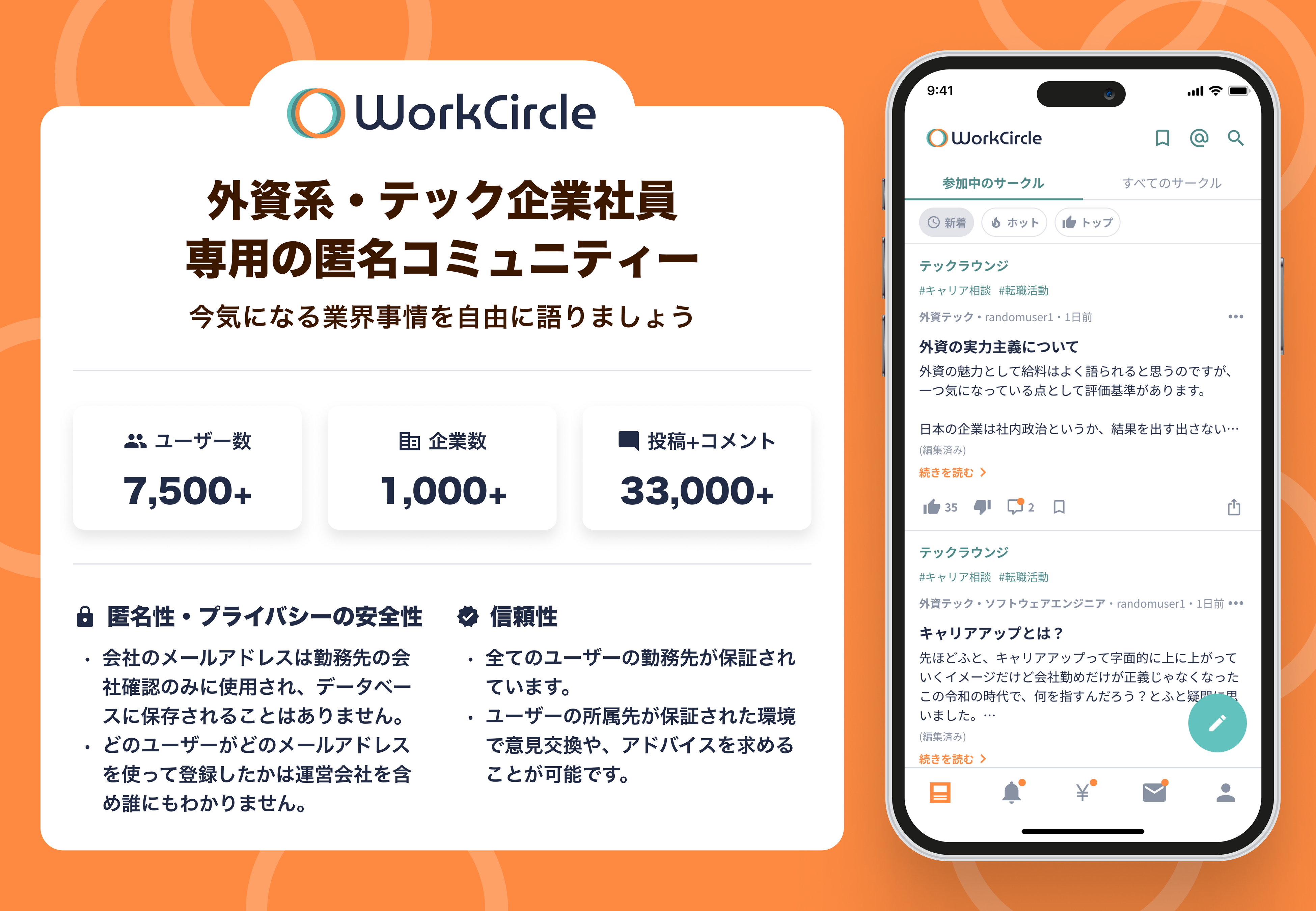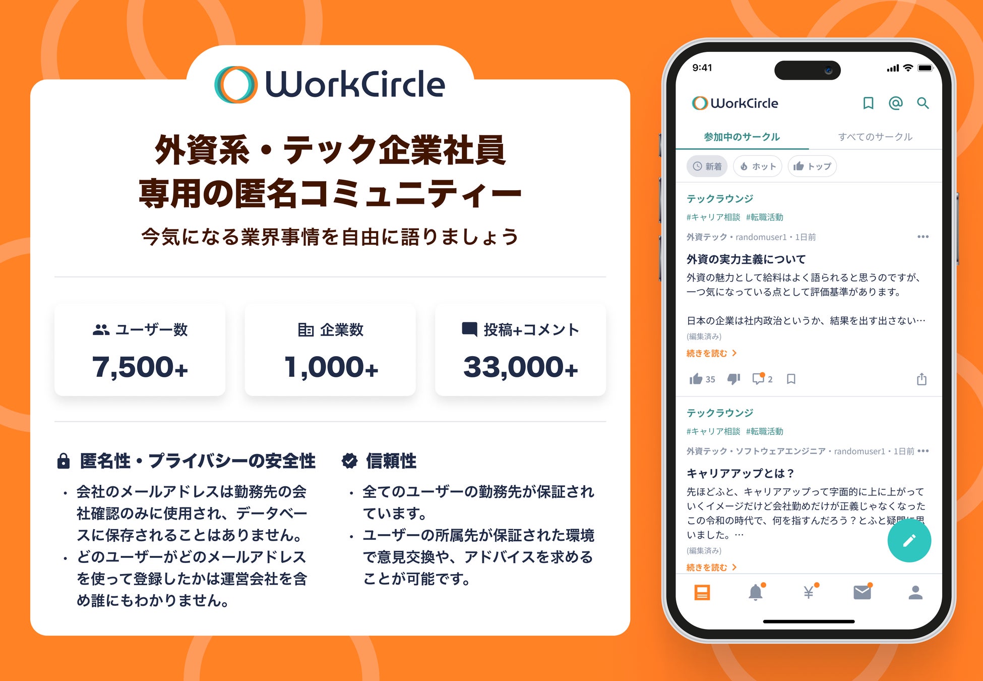 2023年3月8日にリリースしたWorkCircleは「テック業界で働いている」という共通点を持った人々が繋がり、自由に本音で語り合える匿名コミュニティです。情報格差のリアルを継続的に提供してきたWorkCircleでは既に1,000社、7,500名以上のユーザーにご登録いただいており、キャリア、年収、ライフイベントから恋愛まで、社内や人前では相談しづらいトピックが日々議論されています。
