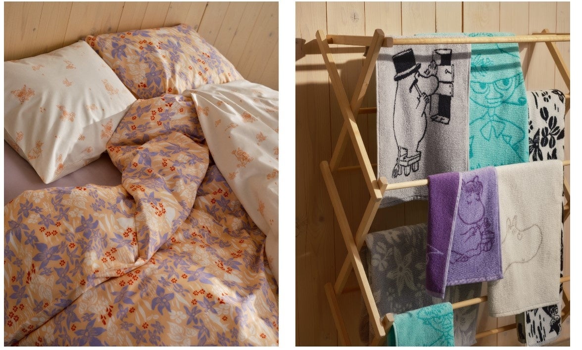 ムーミン アラビアのデザインのベッドリネンやタオルといったテキスタイルは、フィンランドで2023年8月に発売し、完売が相次いだ人気アイテム。オーガニックコットン 100%を使用したタオルは厚手で敏感肌の方にも優しいソフトな肌触り、ひとりずつキャラクターが描かれたカラフルなデザインが特徴です。