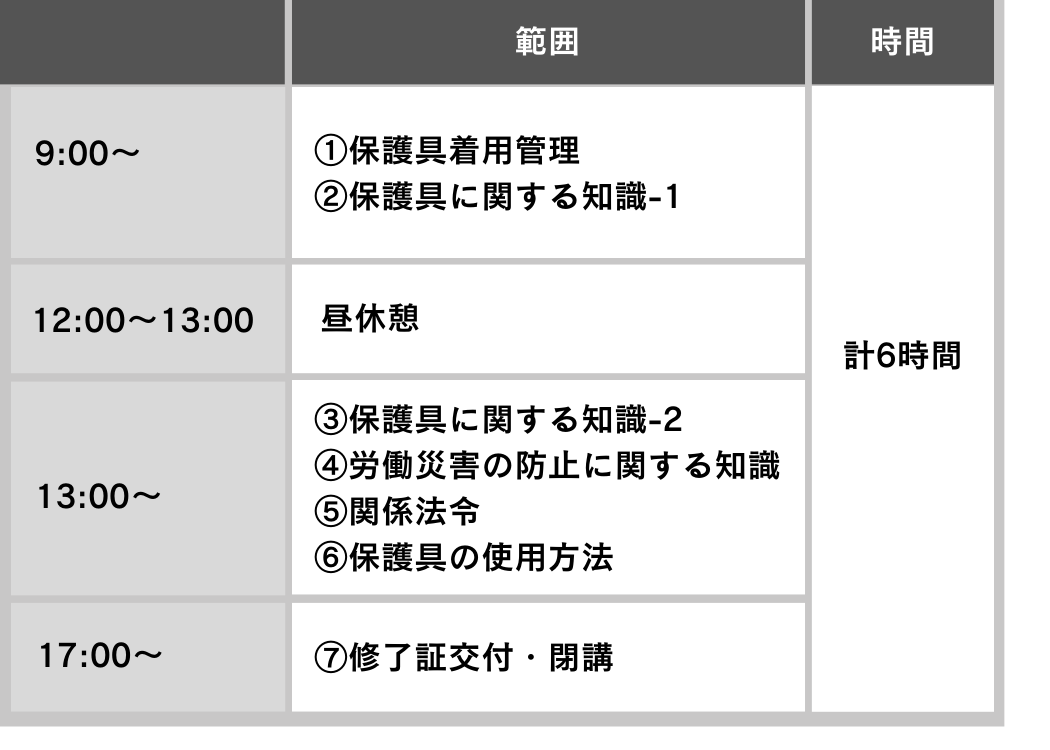 講義内容は、厚生労働省策定の「保護具着用管理責任者教育カリキュラム」に基づき下表のように行っています。