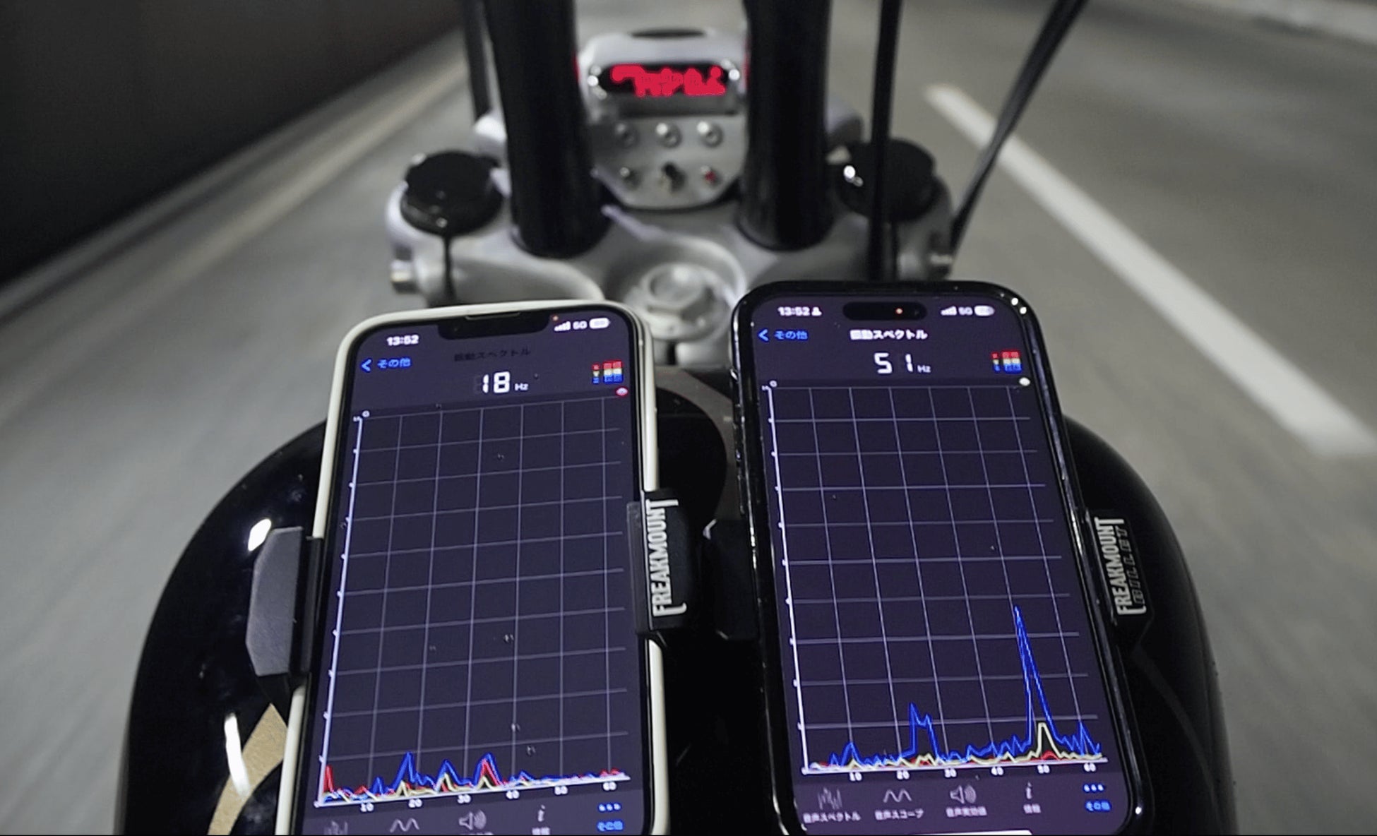 FREAKMOUNT2.0を従来品のFreakMountと同時に装着して振動を計測した所、FREAKMOUNT2.0の方が僅かながら振動が少ない結果となりました。従来品でも他社製ハンドルマウントのスマホホルダーより振動の影響が少なかった所、更に振動の影響を軽減することが出来ております。