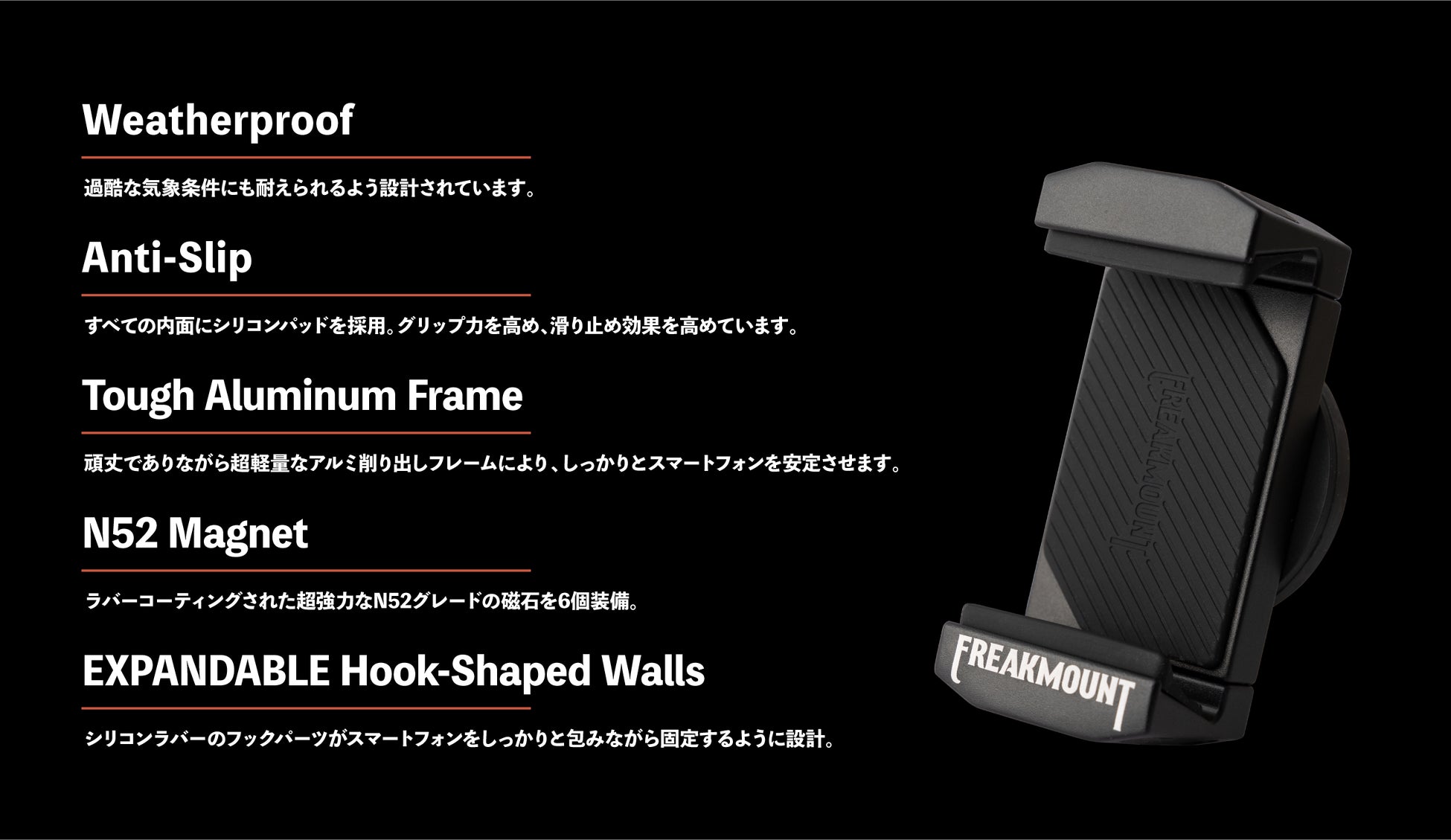 FREAKMOUNT(フリークマウント)は、無駄を削ぎ落としたシンプルなデザインと、ビレットアルミニウムボディ+工業用スプリング+ラバーコーティングされた超強力N52ネオジムマグネットの組み合わせにより、バイク用スマホホルダーに革命を起こしました。