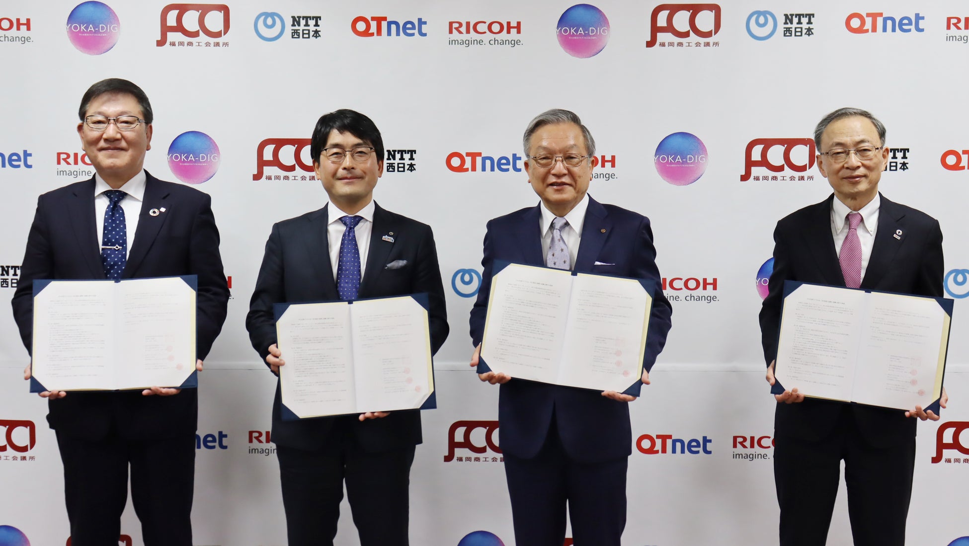 福岡商工会議所(会頭 谷川 浩道)は、西日本電信電話株式会社九州支店(執行役員 九州支店長 梶原 全裕)、株式会社QTnet(代表取締役 社長執行役員 岩﨑 和人)、リコージャパン株式会社福岡支社(執行役員 九州地域担当 兼 福岡支社長 吉村 隆男)と、「中小企業デジタル化・DX推進の連携と協働に関する覚書」を下記のとおり締結し、「福岡中小企業デジタル化・DX推進コンソーシアム」(以下、YOKA-DIGI(よかデジ))を設立することといたしました。