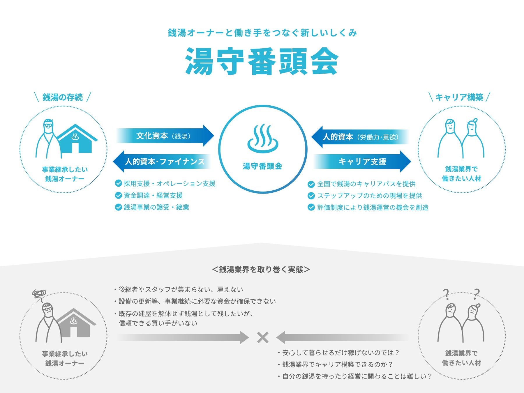 銭湯を文化資本として守り、持続可能な経営を支援する新たな取り組み。業界が直面する課題に対し、人材育成・雇用支援といった「人」、経営・資金調達といった「金融」の側面から、「銭湯の未来のために何ができるか」を問い続けている。