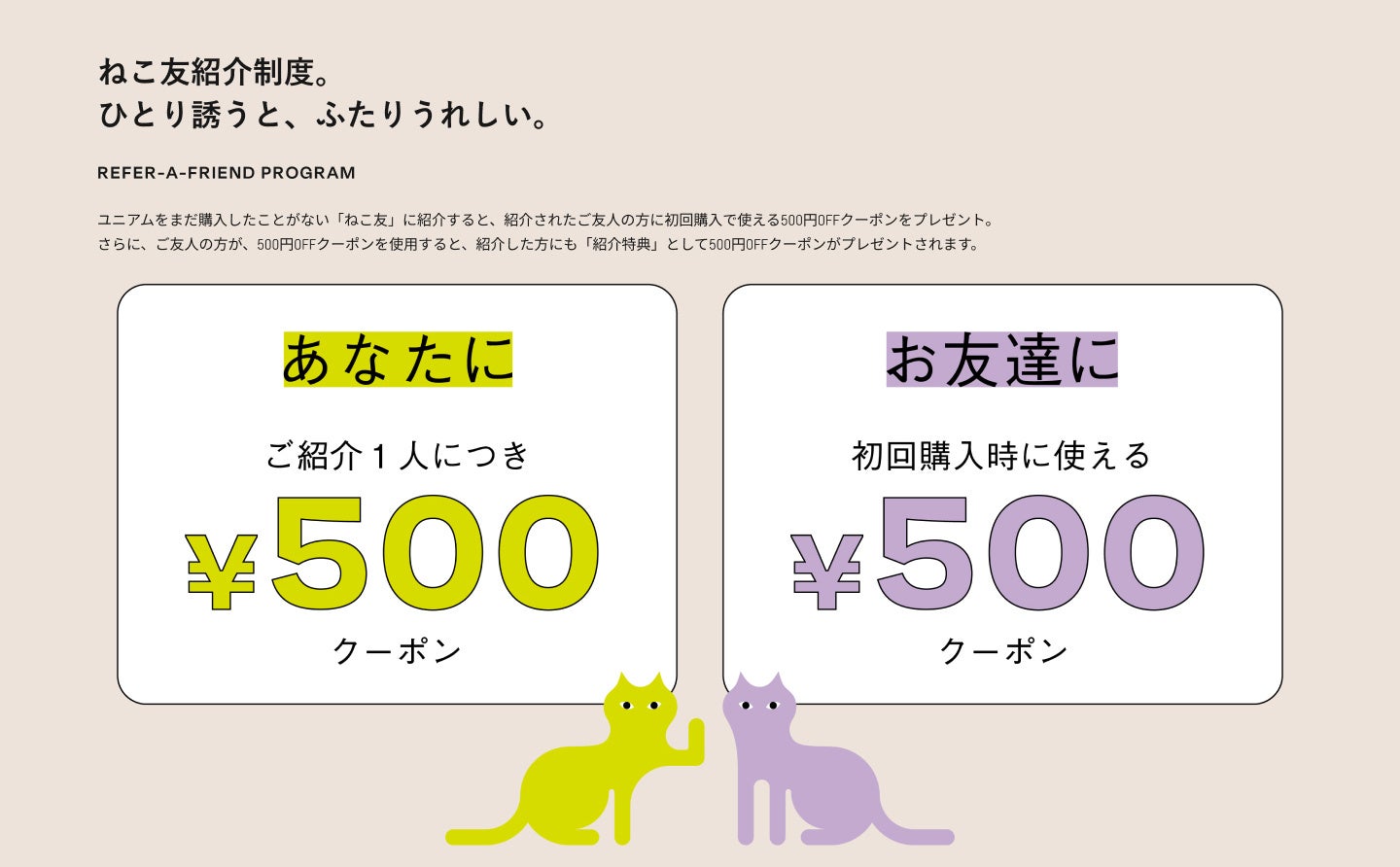 また、ユニアムを継続利用いただいている方が、ねこ友にユニアムを紹介すると、紹介した方・された方それぞれへ500円オフクーポンがプレゼントされる「ねこ友紹介制度」も同時にリリースいたします。