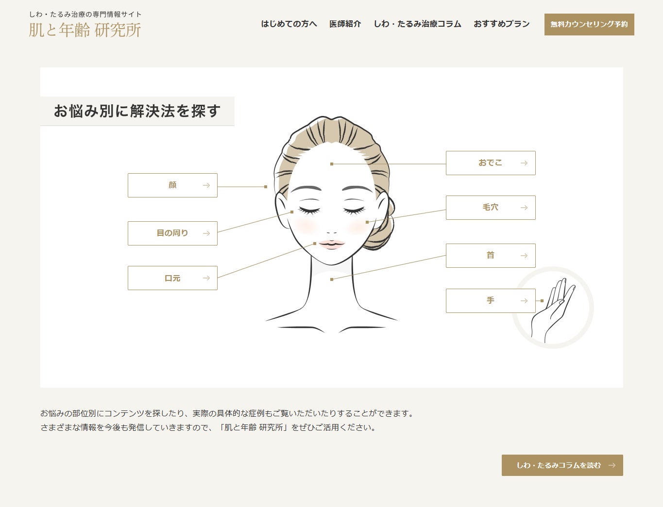 お悩みの部位別にコンテンツを探すことや、実際の改善症例をご覧いただくことも可能で、しわ・たるみのお悩みに関する知りたい情報にアクセスしやすくなっています。