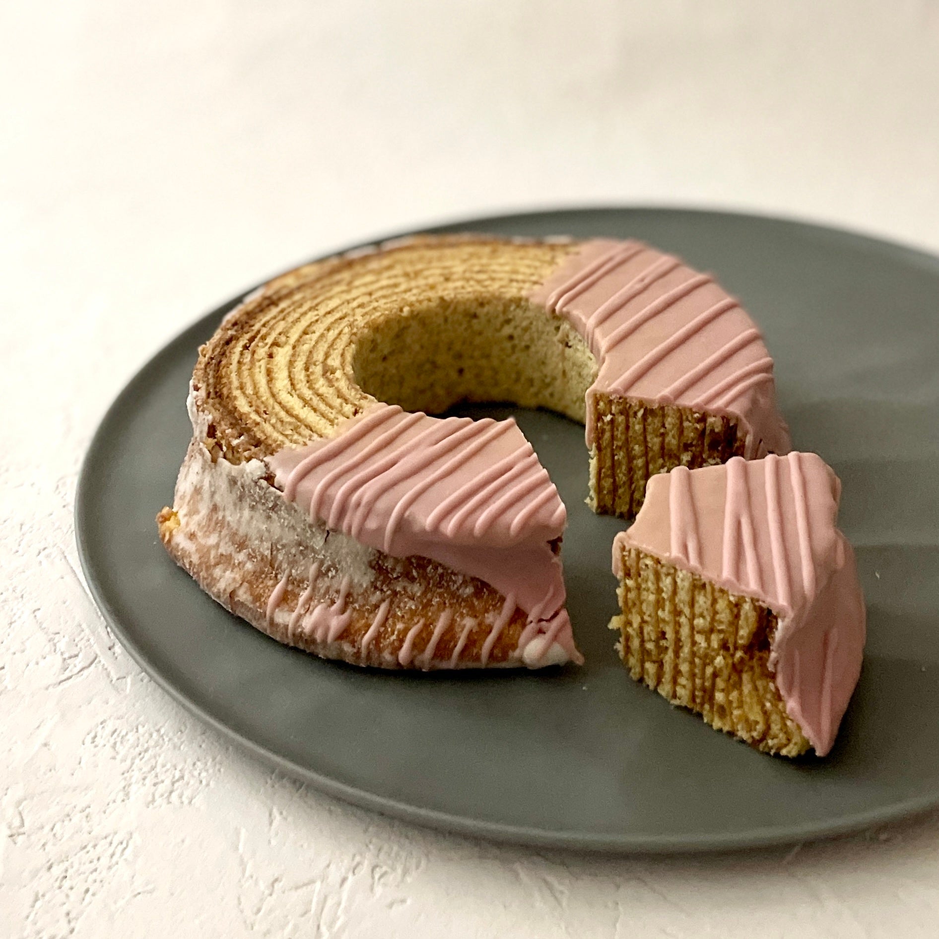 商品特徴:しっかりと焼き上げたバニラ香るハードタイプのバウムクーヘンとルビーショコラを合わせました。