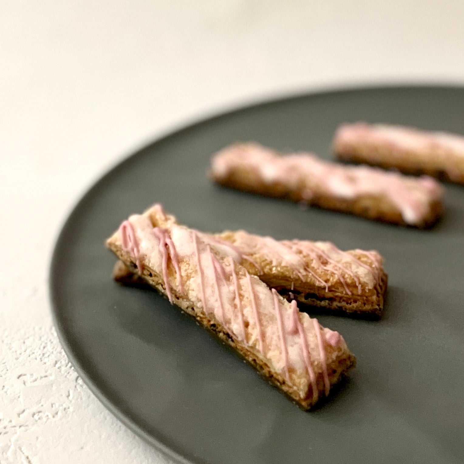 石川県産米粉を使用した抹茶サブレとサクサクのパイの組み合わせに、爽やかな梅酒のグラスとルビーショコラを合わせました。(チョコレートのうち、ルビーショコラ50%使用)