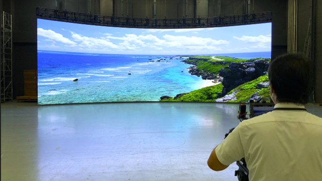 被写体の背面に設置したスクリーンにバーチャル映像を映し出し、人や物などの被写体と組み合わせてリアルタイムで映像制 作を行う技術