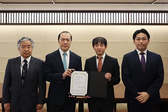 授与式の様子:(右から)BULL CEO 宇藤恭士、BULL CTO[兼 帝京大学 理工学部航空宇宙工学科 准教授]河村政昭、帝京大学 理事長・学長 冲永佳史様及び帝京大学 産学連携推進センター教授 中西穂高センター長