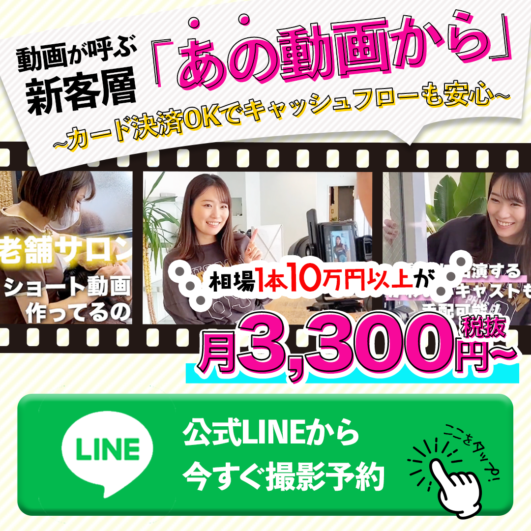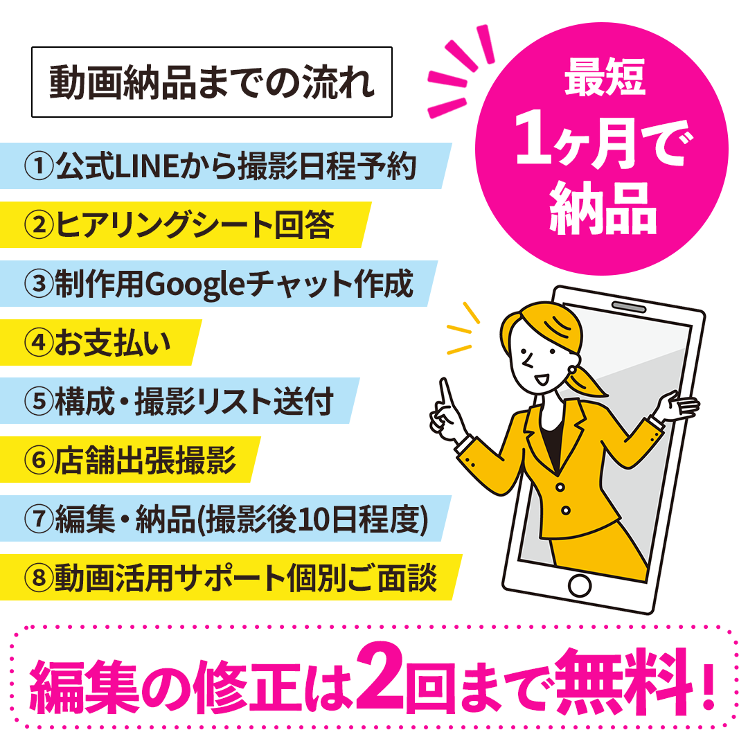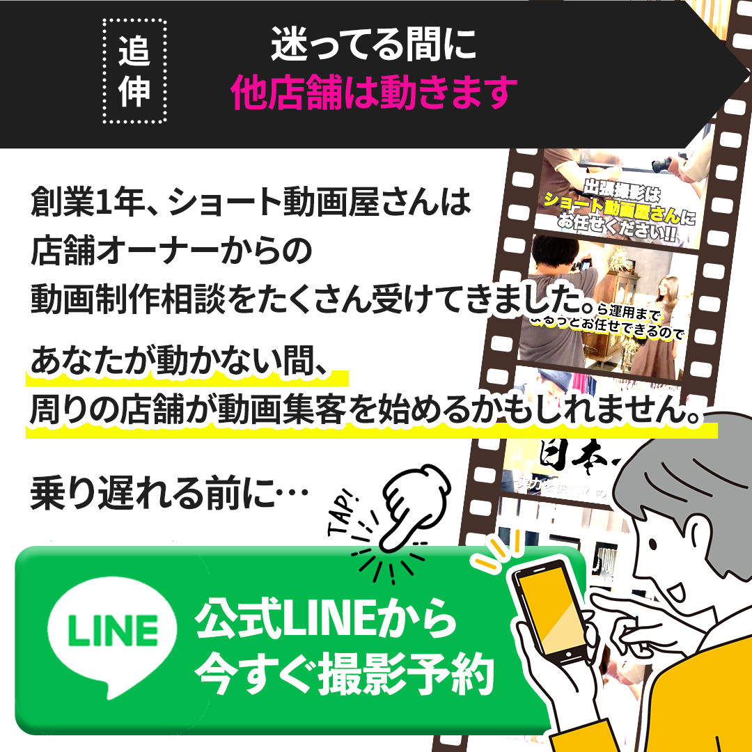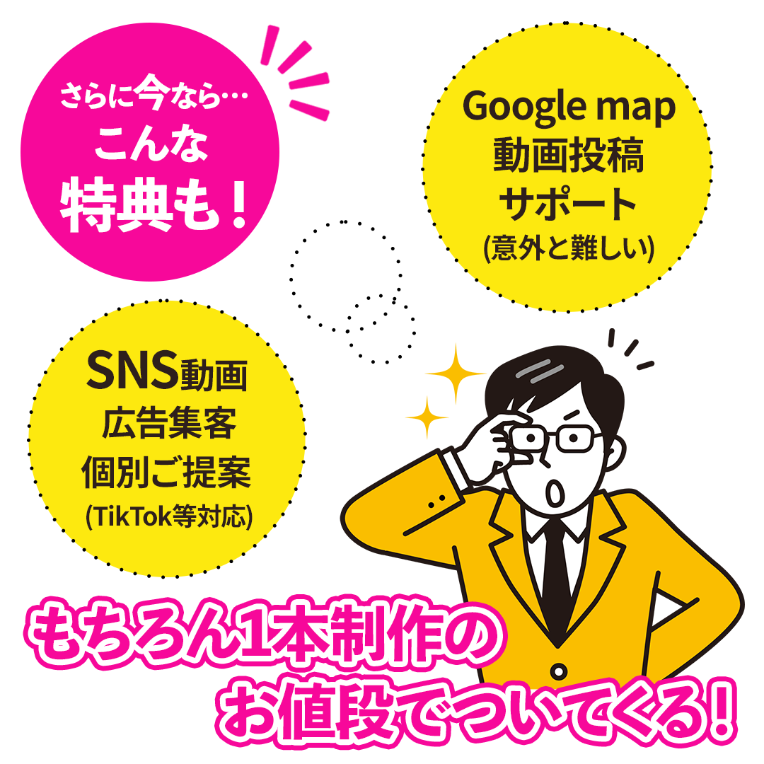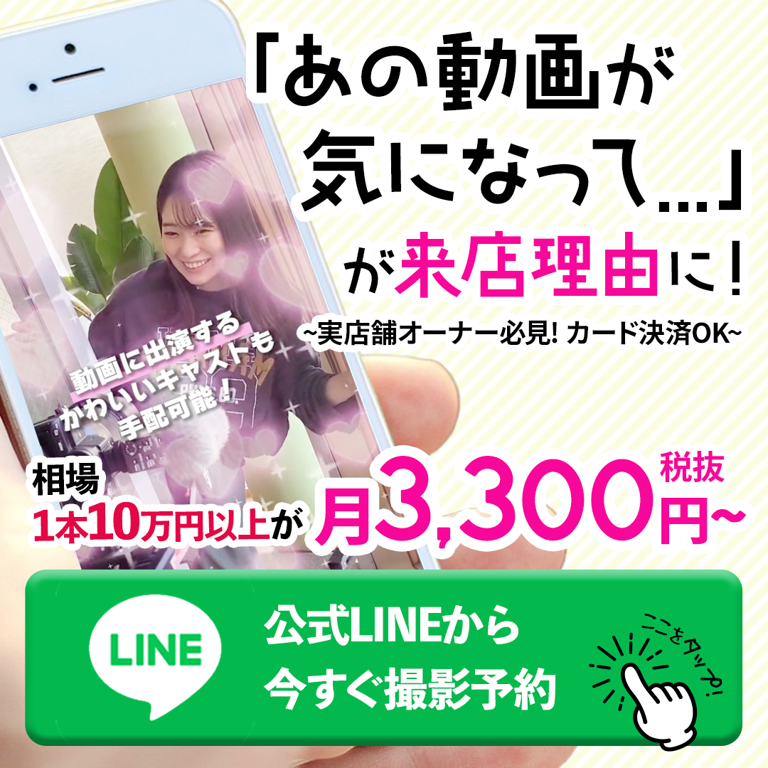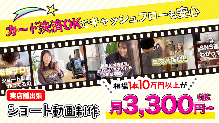 「あの動画から…」Google map・TikTokやYouTube等各種SNS対応30秒以内店舗紹介動画。チェーン店OK・出張撮影素材二次利用OK・カード決済OK30回払いでキャッシュフロー安心