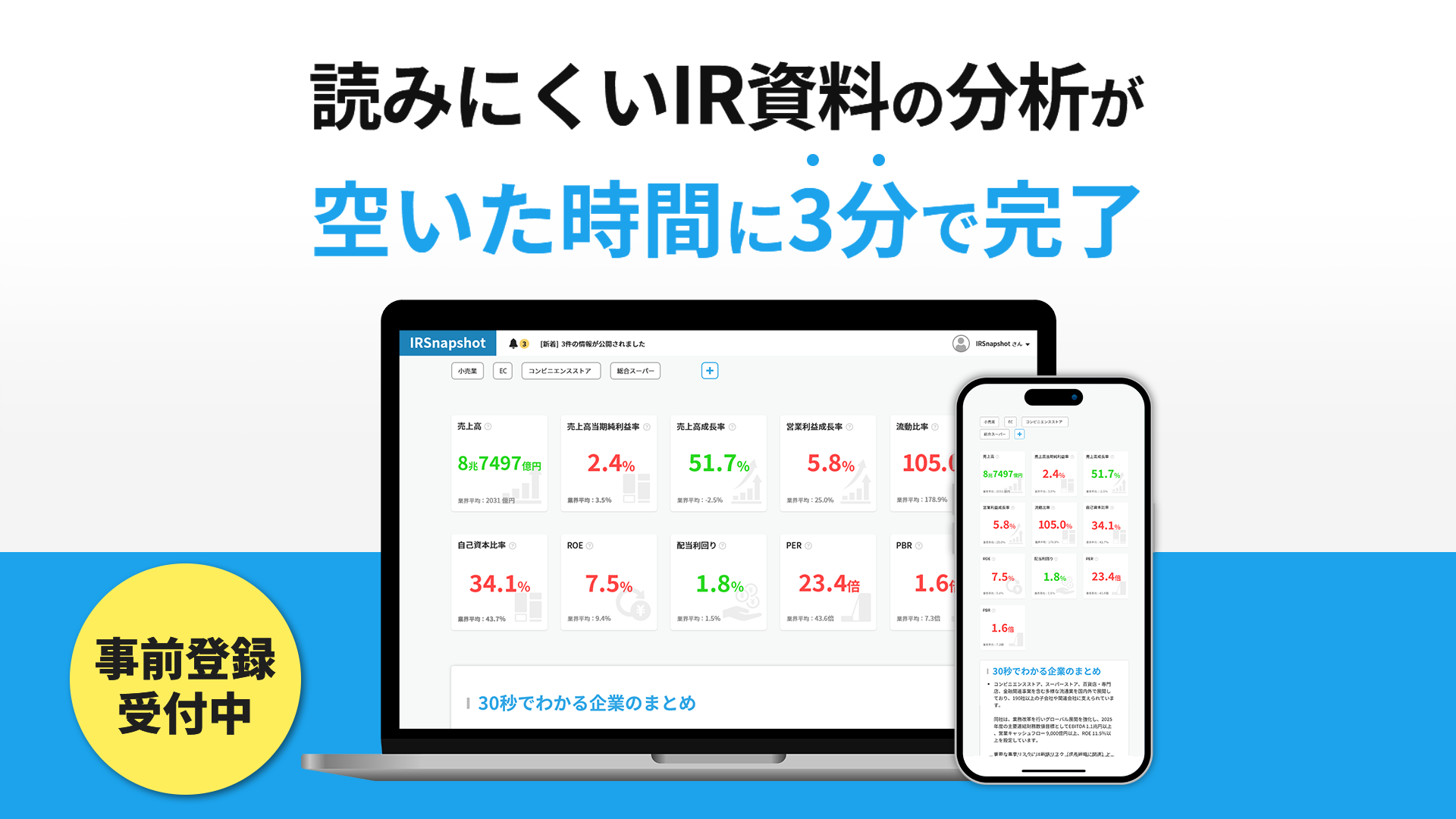 時間のかかる企業分析がスキマ時間でサッと確認するだけ、「IRSnapshot」が事前登録を開始!