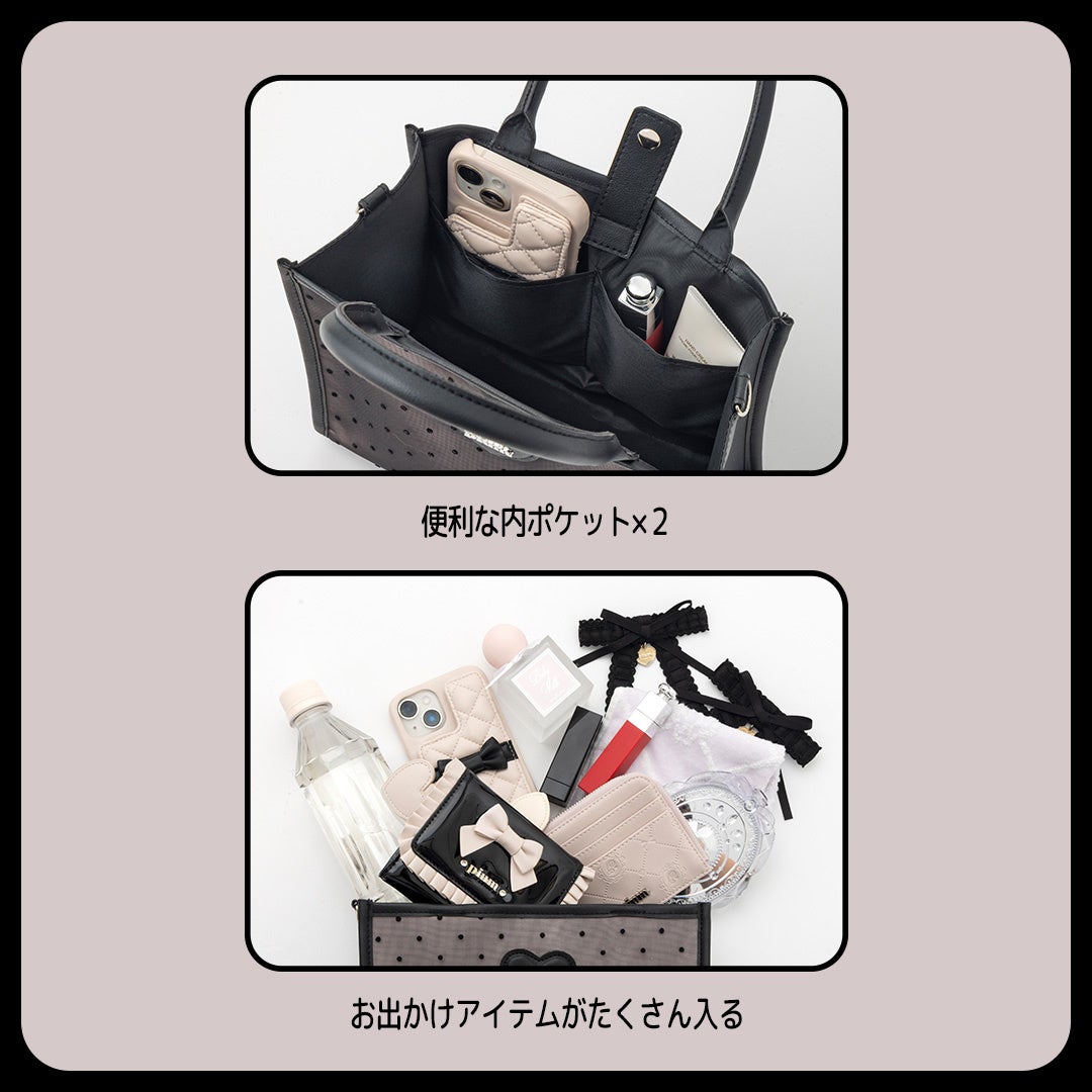 トートバッグは500mlのペットボトルも横向きにすっぽり収納できるほどの大容量で、小物が整理しやすい内ポケット付き。