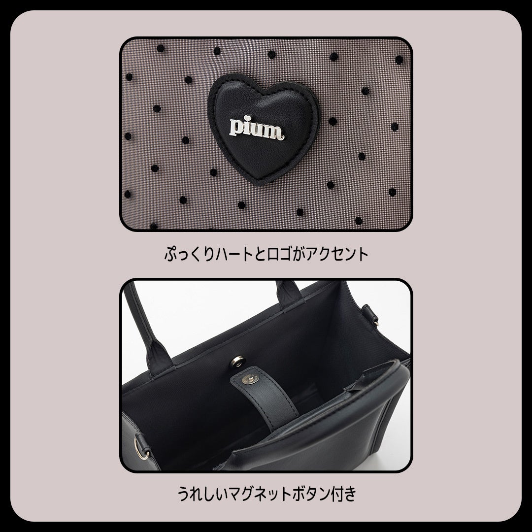 『pium 5th ANNIVERSARY SPECIAL BAG BOOK』は、ドットチュールが大人可愛いオリジナルトートバッグ付き。かっちりとしたフォルムで高見えするトートバッグは、piumらしいブラック×ピンクのバイカラーにブランドアイコンのぷっくりハートを取り入れた、どんなスタイルにも合わせやすいアイテムです。