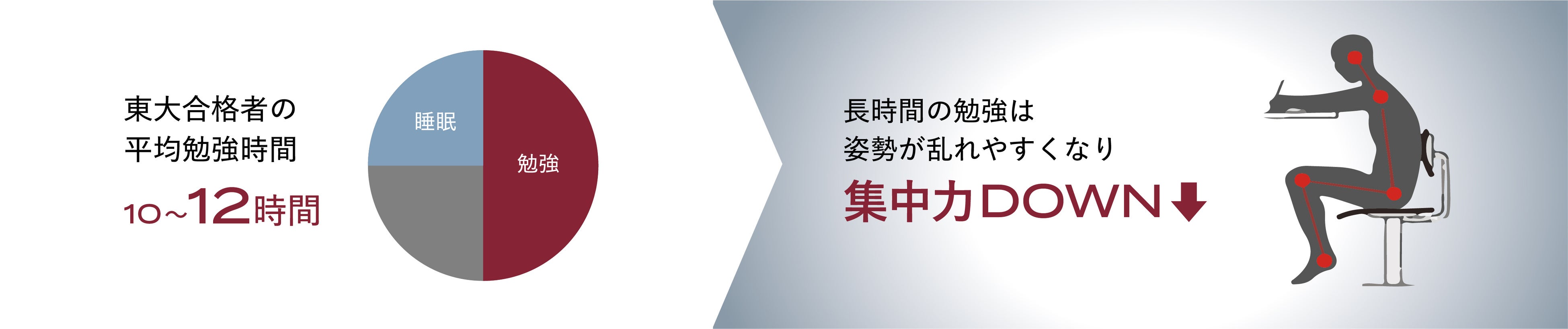 例えば、東大合格者の平均勉強時間は1日10〜12時間ともいわれ、長時間の前かがみ姿勢は首や肩甲骨まわりに負担をかけ、呼吸を浅くし、脳の回復を妨げる要因となります。