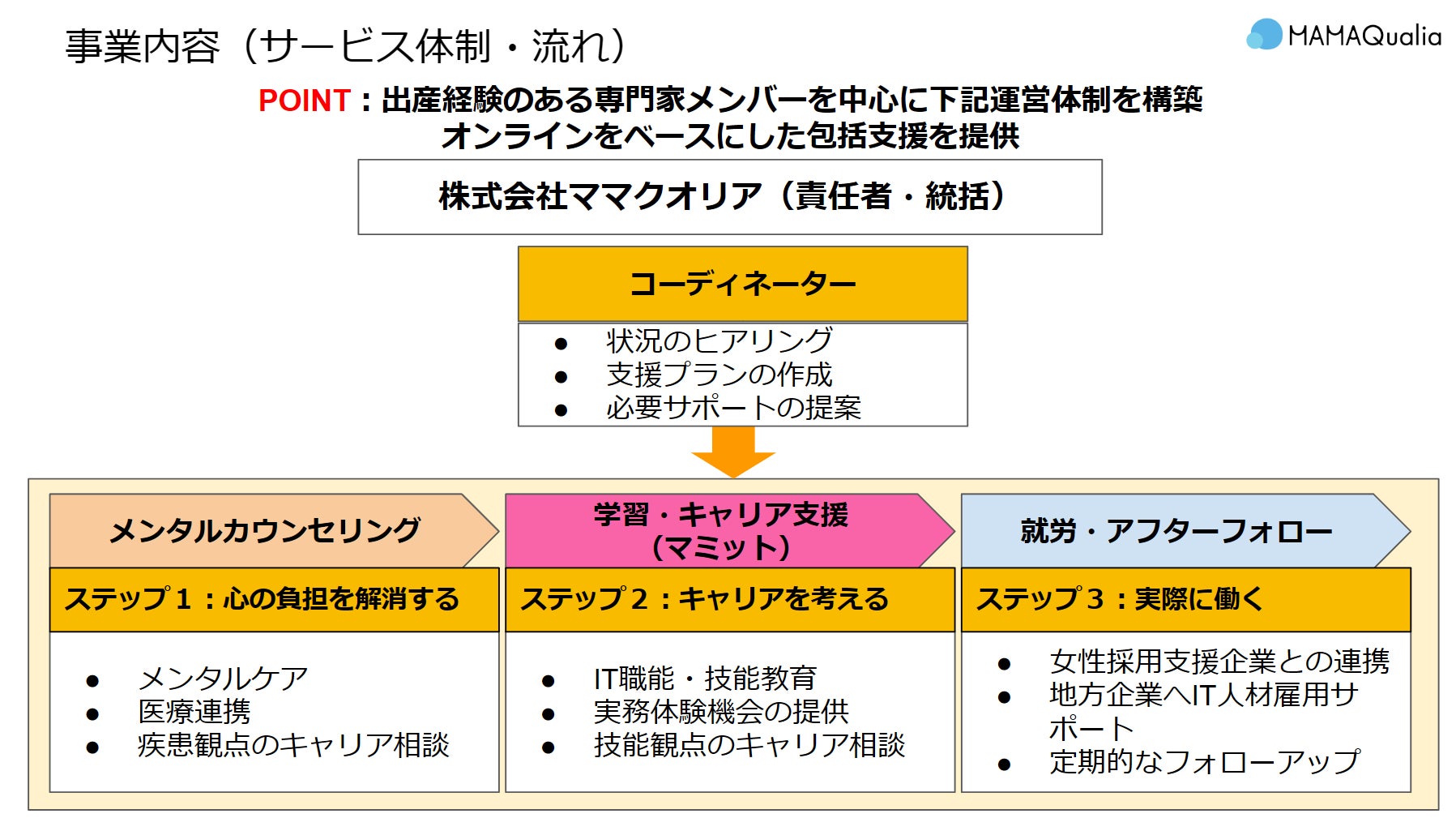 代表の塚越自身も産後うつを経験し、適切なケアを受けられなかった結果、双極性障害とともに生きることになりました。「この苦しみを誰にも味わってほしくない」その強い想いから、ママクオリアの事業はスタートしています。