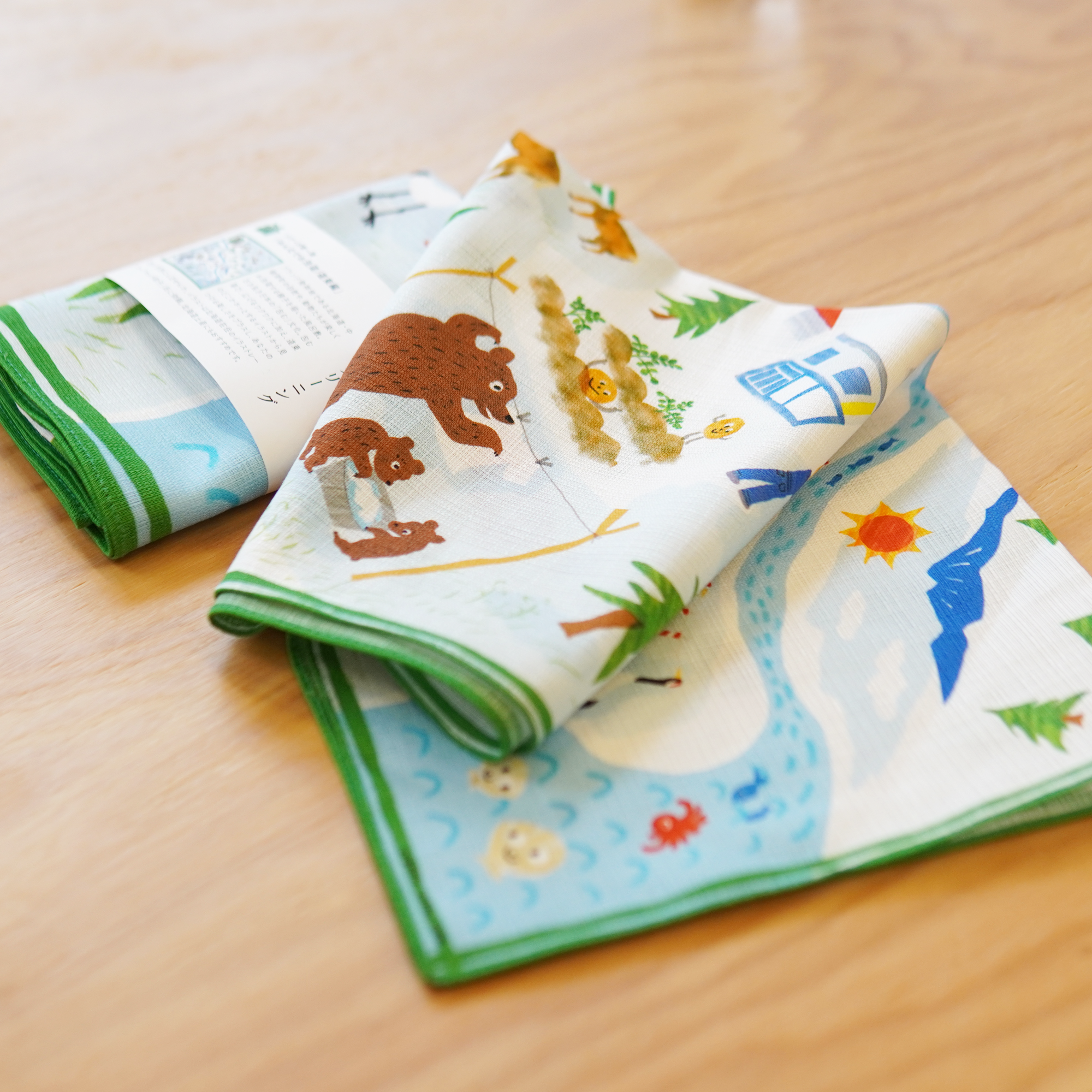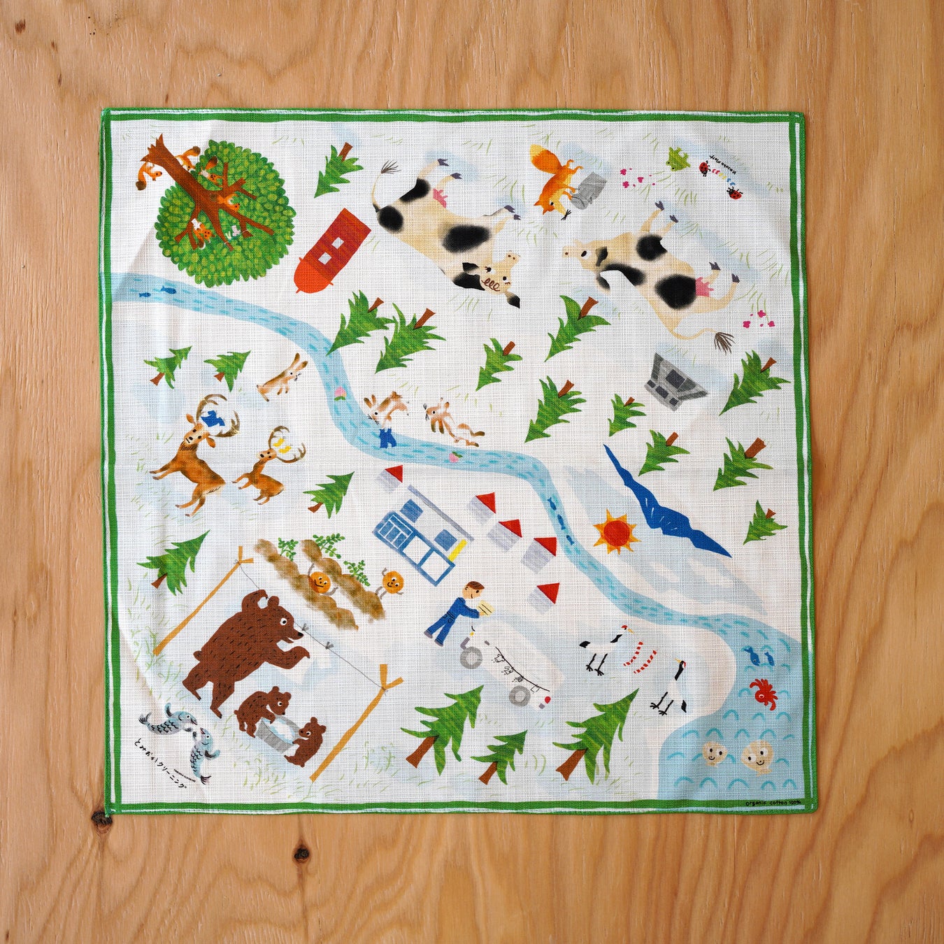 木彫り熊キャンドルに次ぐ、北海道のお土産シリーズ第二弾となる「風呂敷」。北海道東部・中標津町の野山や海川に生きるいきものたちを擬人化し、みんなで楽しくお洗濯をする様子を、イラストレーターマット和子さんにほっこりと描いてもらいました。日本で古くから愛用されている「風呂敷」。現在もエコバッグとして愛用されており、またその柄を愉しむのも、風呂敷の魅力のひとつであります。エコバッグとしての収納力は、布一枚であることで収納負担が無く、必要な時・必要に応じて活用できる懐の深さ。旅行や外出先では、バッグインバッグとしても、着替えをまとめたり、お弁当を包んだり、敷物や日よけのスカーフや帽子としても使えます。またその柄を活かして、季節の贈り物を包んだり、そのまま「ギフト」として差し上げても喜ばれます。改めていま、風呂敷の魅力を衣類を扱う私たちが私たちの視点で発信します。サイズは45×45㎝、70×70㎝の2サイズ。用途に合わせて、サイズをお選びください。