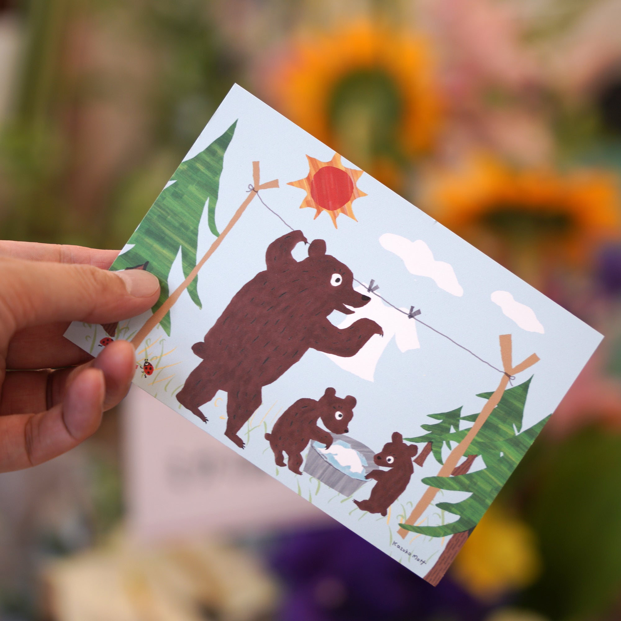 風呂敷のデザインにも載っている熊の親子の「なかよくお洗濯」するイラストのポストカードも限定制作しました。風呂敷(2サイズ)いずれかをお買い上げの方先着100名様にポストカードをレゼント。ポストカードは330円で一般販売もいたします。販売は、ECサイトを含む全直営店舗で発売します