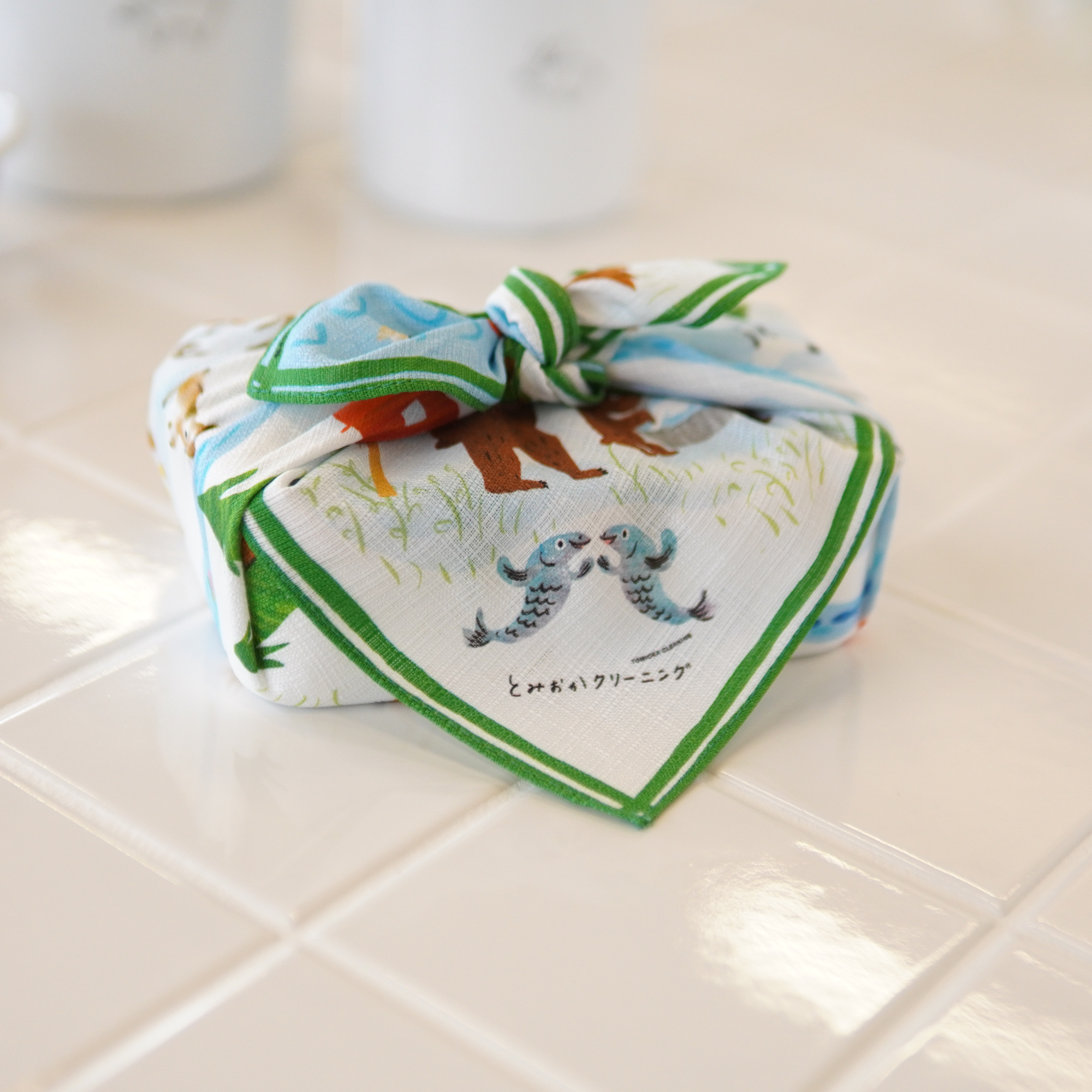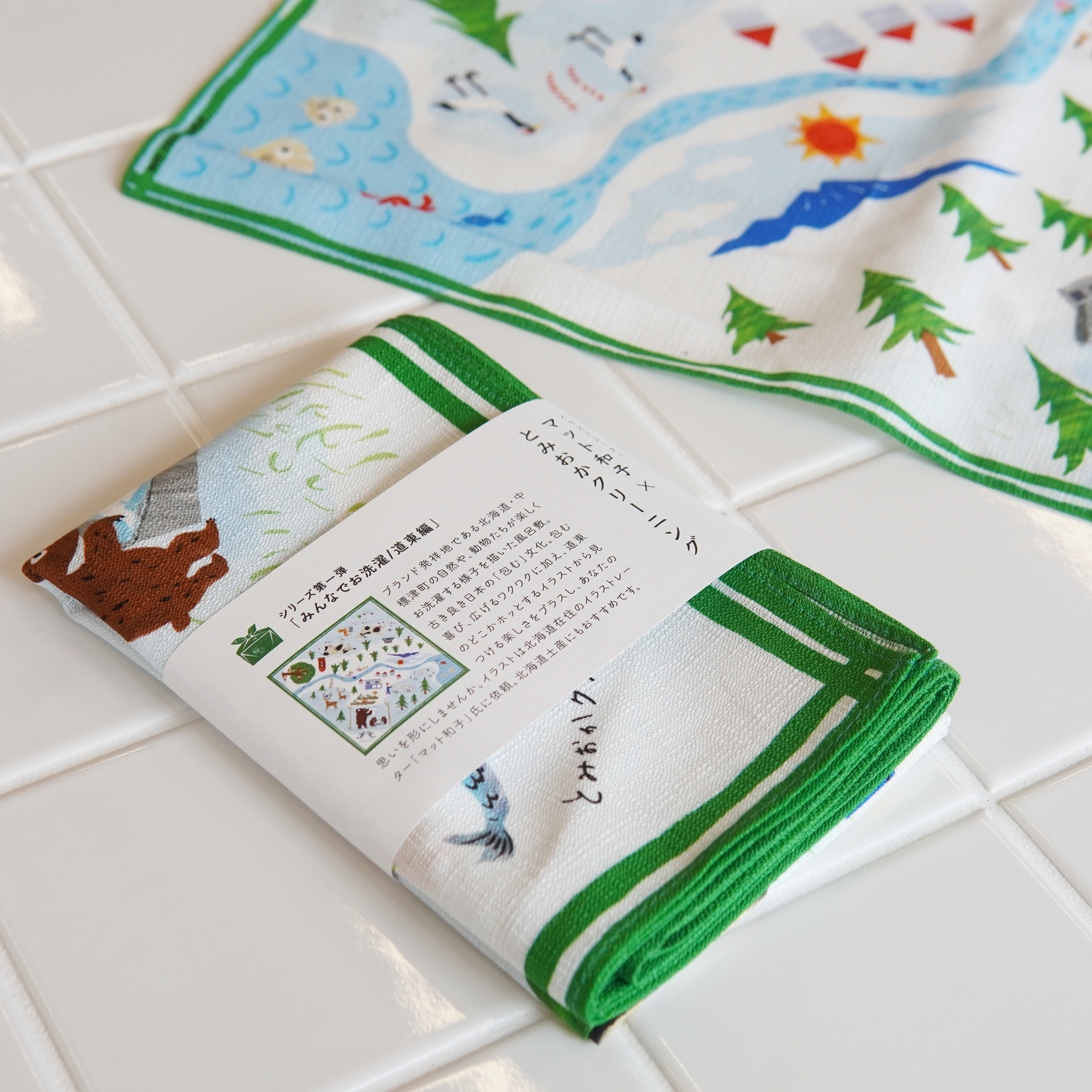 風呂敷デザインは札幌在住イラストレイターマット和子氏により中標津町の野山や海川で生活する動物たちを擬人化し楽しそうにみんなでお洗濯をする風景をかわいく、カラフルに描いたデザイン。酪農の町・中標津町を象徴するいきものである牛やサイロ、山や森、海や川に生息するタンチョウヅルや鮭やホタテたちもデザイン。とみおかクリーニング号や本店も描かれているので、探してほしい。北海道・中標津町のデザインすることで、風呂敷を使う方、もらった方が笑顔になるように、また北海道土産として選ばれることも目指しています。
