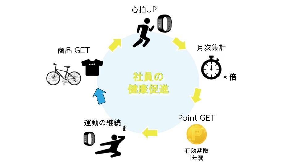 「DOKIDOKIポイント」は、社員が日常生活や勤務中に運動を行うことでポイントが貯まる制度です。中強度心拍数1分につき1ポイントずつ貯まり、選択したコースに応じ異なる掛け率でポイントを集めます。貯めたポイント数に応じて、年に一度当社独自開発中の商品との交換が可能です。この取り組みにより、社員の健康増進と生産性向上を目指します。