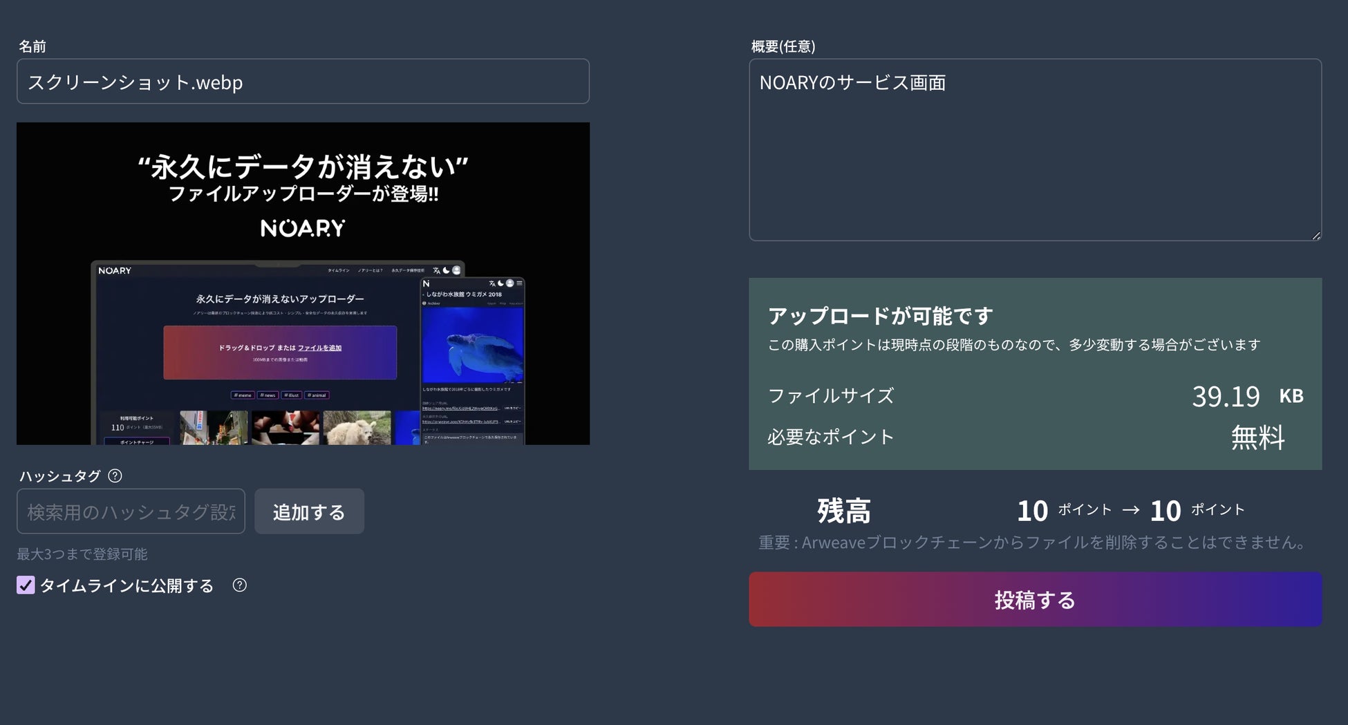 *100kb未満のファイルをアップロードする場合、画像のようにドラッグ&ドロップをするだけでポイントを消費せずにブロックチェーンへファイルをアップロードできます。(「公開する」チェックを外すとプライベートな投稿となります)