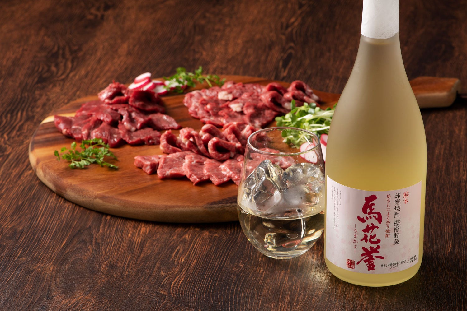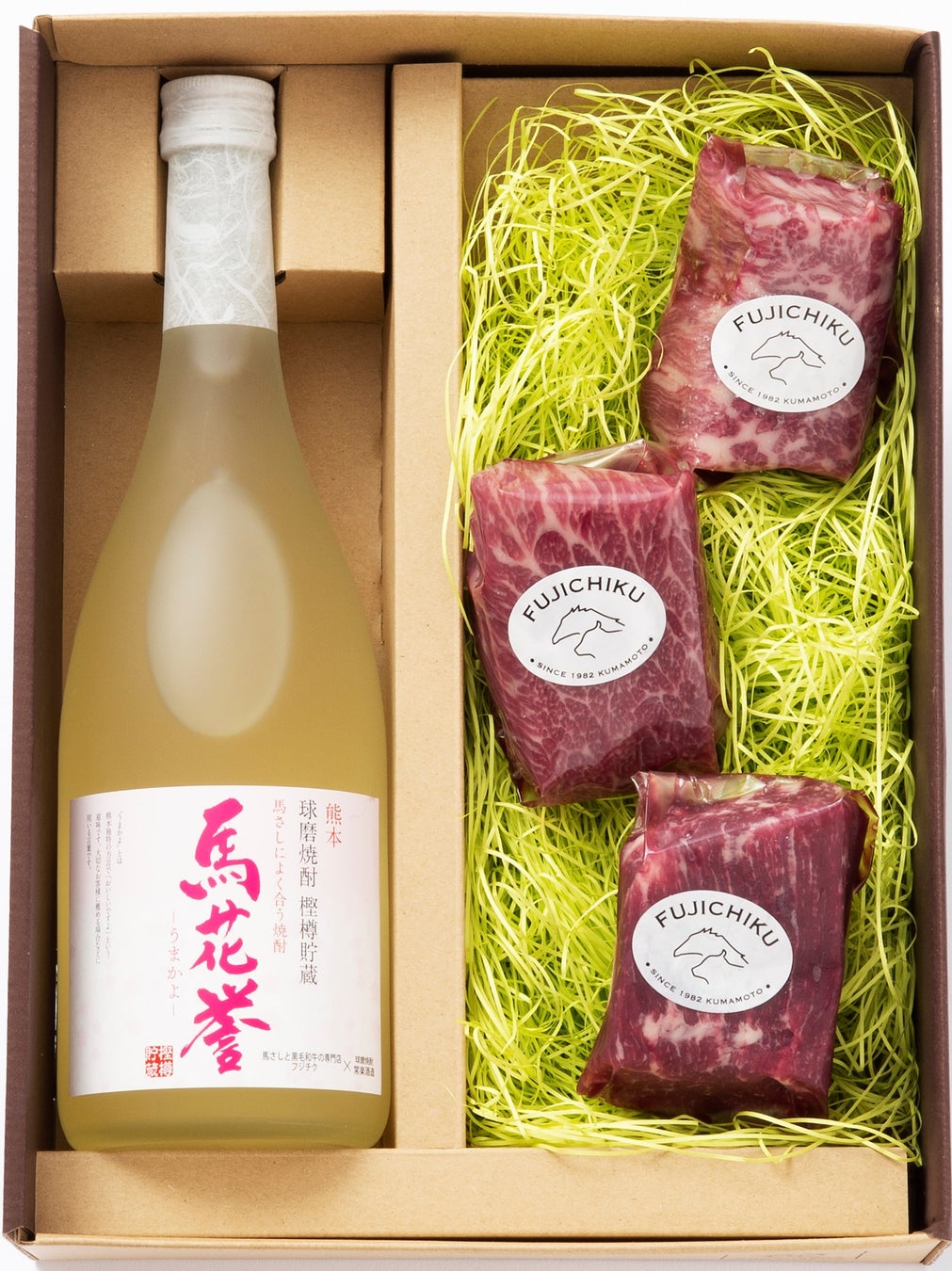 特選霜降り馬刺しの大トロを含む人気馬刺しと、馬刺しの旨味をさらに引き立てる本格米焼酎のセット商品。贈りものとして大人気です。