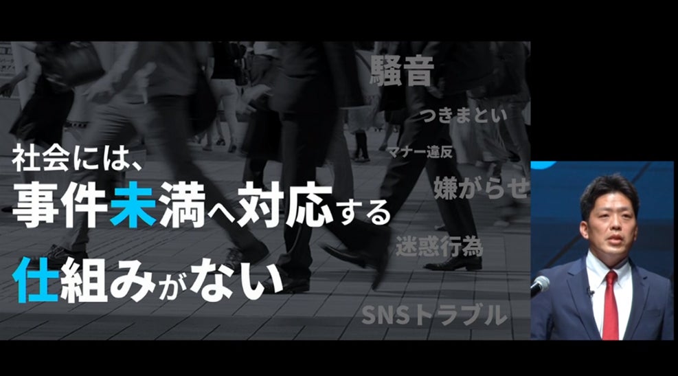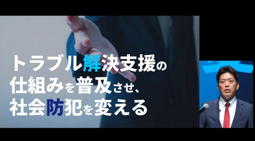 また、「新たな社会防犯として、仕組みがないなら創ればいい。かつて取り扱う機能がないばかりに行き場を失くし、重篤化してきた困りごとの一番の相談先となるサービスを提供する。」と、当社が提供する定額制サブスク型のトラブル解決支援サービスの内容と、当社の目指す「トラブルを事件にしない社会」についての熱い想いを語りました。