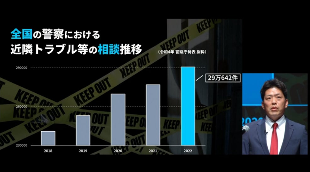 当社代表の田中はピッチの冒頭で、昨年の30万件にも迫る全国の警察に寄せられた近隣トラブルの件数と、近隣トラブルに起因する多くの事件の報道を引き合いに出し、「防げるはずの事件を防ぐ、新しい社会インフラを創る」というテーマでのピッチを行いました。