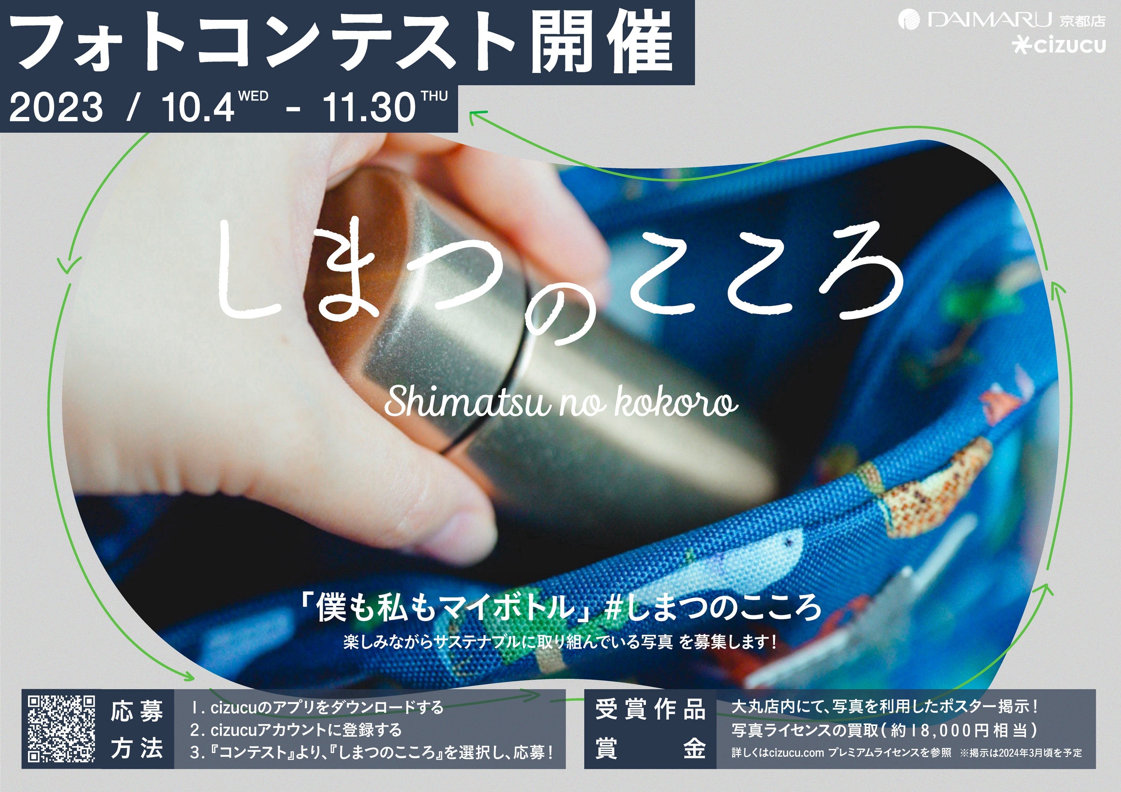 皆様一人一人の『しまつのこころ』をテーマに、楽しむサステナブルを写したフォトコンテスト。好きだからそうしているけれど、サステナブルにつながる暮らしを写した写真。あるいは、ゴミの落ちている公園で遊ぶ子どもたちなど、環境活動に取り組むきっかけとなる、メッセージを込めた写真など。皆様の心に受け継がれてきた、『しまつのこころ』に通ずる日常の情景を、自由に表現した写真を募集します。そして、受賞作品は、ポスターになり大丸京都店内に掲出させていただきます。