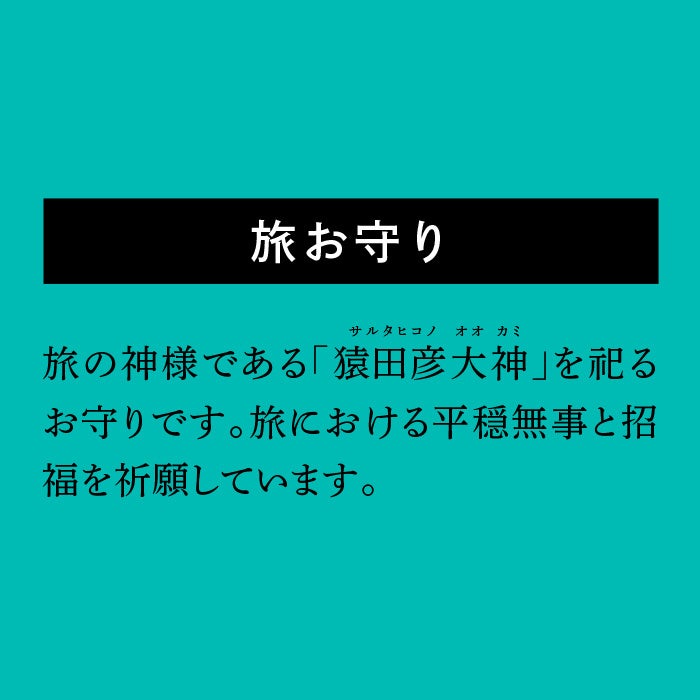 旅の神様である「猿田彦大神」(サルタヒコノオオカミ)を祀るお守りです。旅における平穏無事と招福を祈願しています。近場の国内旅行から、海外旅行まで、広く旅の幸福を願っています。
