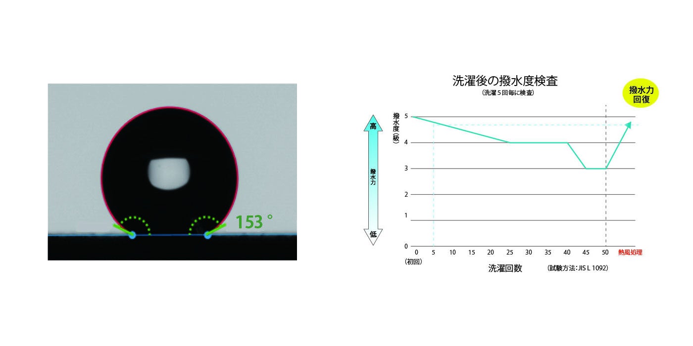 接触角153°で洗濯50回後の撥水持続力と回復力が高い