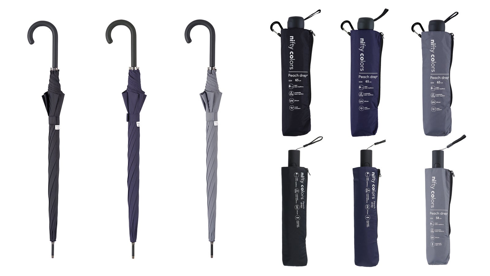 水滴を弾く桃の皮のように、生地の表面が微起毛になっている超撥水生地の傘とレインウェアの「Peach drop」は、発売以来その機能と持続性で人気の商品です。今年はカラーと傘骨、ケースの仕様をリニューアルし更に使いやすく進化しました。傘はユニセックスで使えるベーシックな色からトレンドの淡色カラーまで、傘骨は風速15m/1sに耐えられる耐風仕様から自動開閉までラインナップ、高機能商品なのに買いやすい価格帯もポイントです。どの色も紫外線遮蔽率が90%以上ありますので日傘としても使える最強傘になっています。