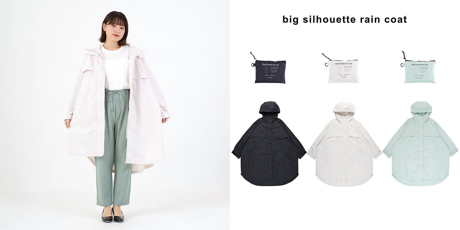 レインコートは、ウエスト部分のギャザーがスタイルアップして見える「ジップロングレインコート」と幅広のゆったりとしたサイズ感が特徴の「ビッグシルエットレインコート」の2タイプ。どちらも雨の日だけでなく晴れの日のデイリーアウターとして活躍するデザインとカラーです。ファスナーポーチ型のケースが付いているのでコンパクトに収納でき、旅行やお出かけの際の持ち運びに便利です。