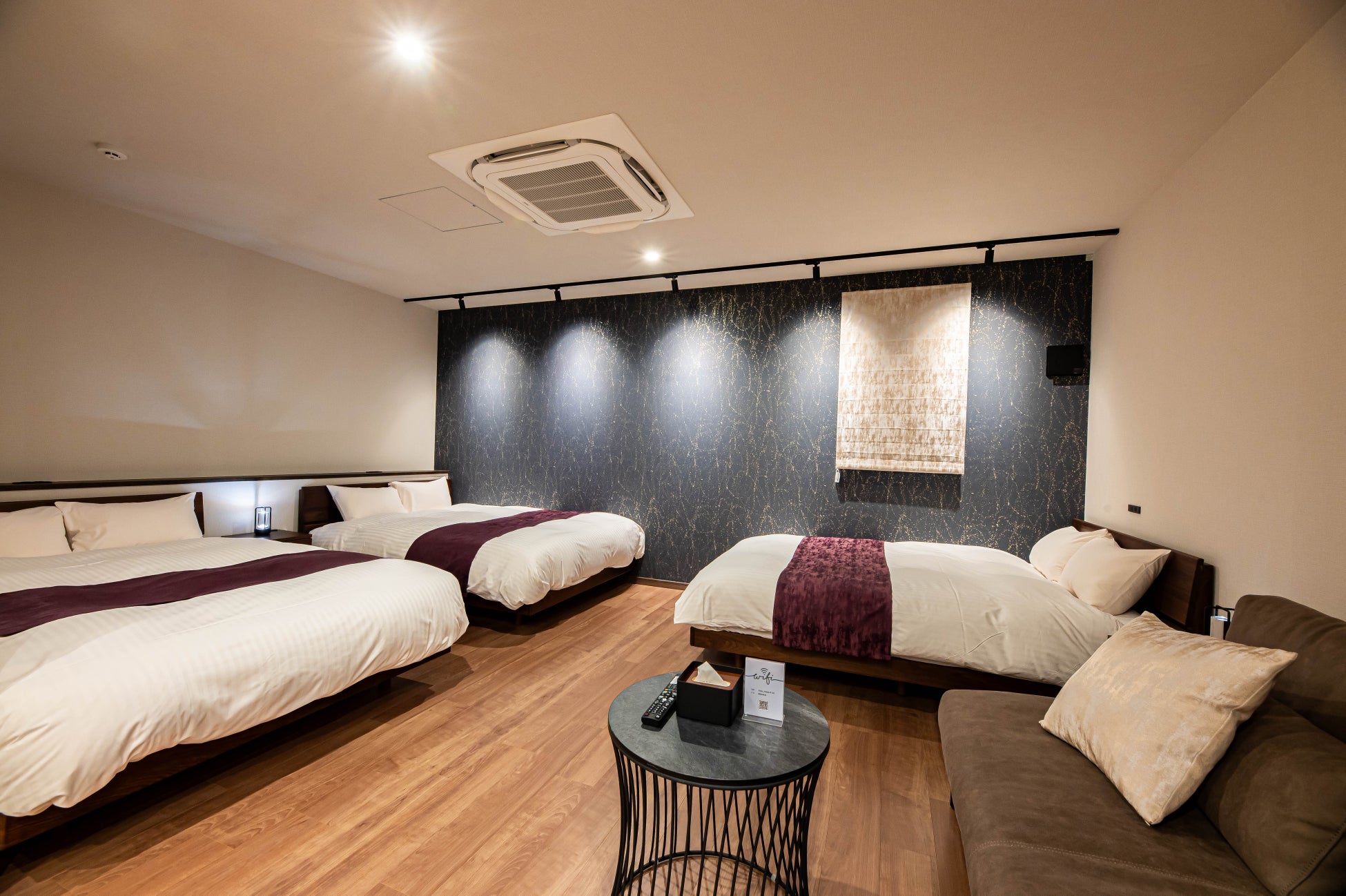 ダブルベッドを4台(1階の客室のみ3台)配置し、最大54.53㎡の広々とした客室で、グループやご家族での滞在にも最適なホテルです。