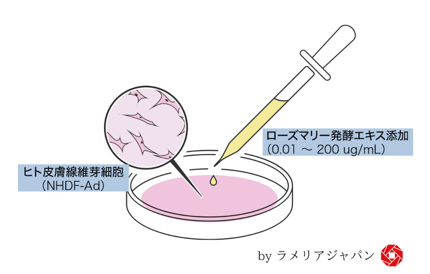 今回の研究では、株式会社ラメリア・ジャパンが製法特許を保有する独自原料であるローズマリー発酵エキスについて、ヒト皮膚線維芽細胞を用いた抗シワ効果の試験としてコラーゲン産生試験を、保湿効果の試験としてヒアルロン酸産生試験を実施しました。